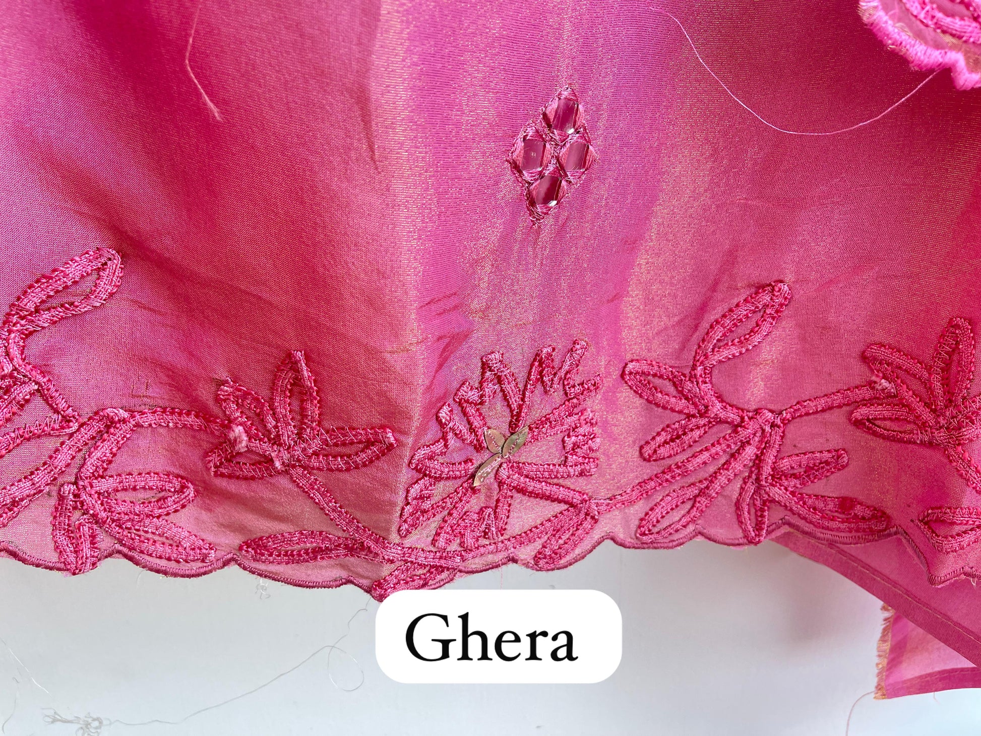 π shimmer silk fabric unstitched shirt with actual mirror leather work resham embroidery and scalping on ghera