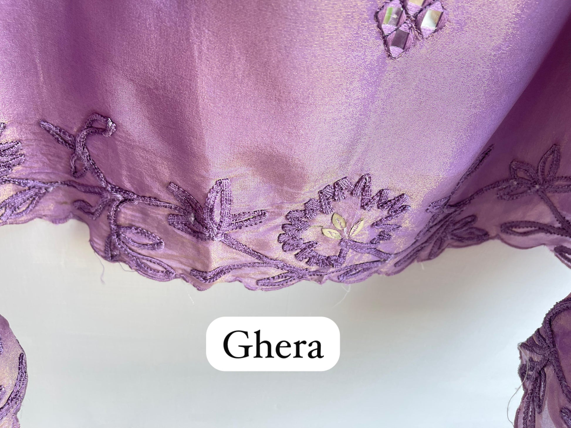 😊 shimmer silk fabric unstitched shirt with actual mirror leather work resham embroidery and scalping on ghera