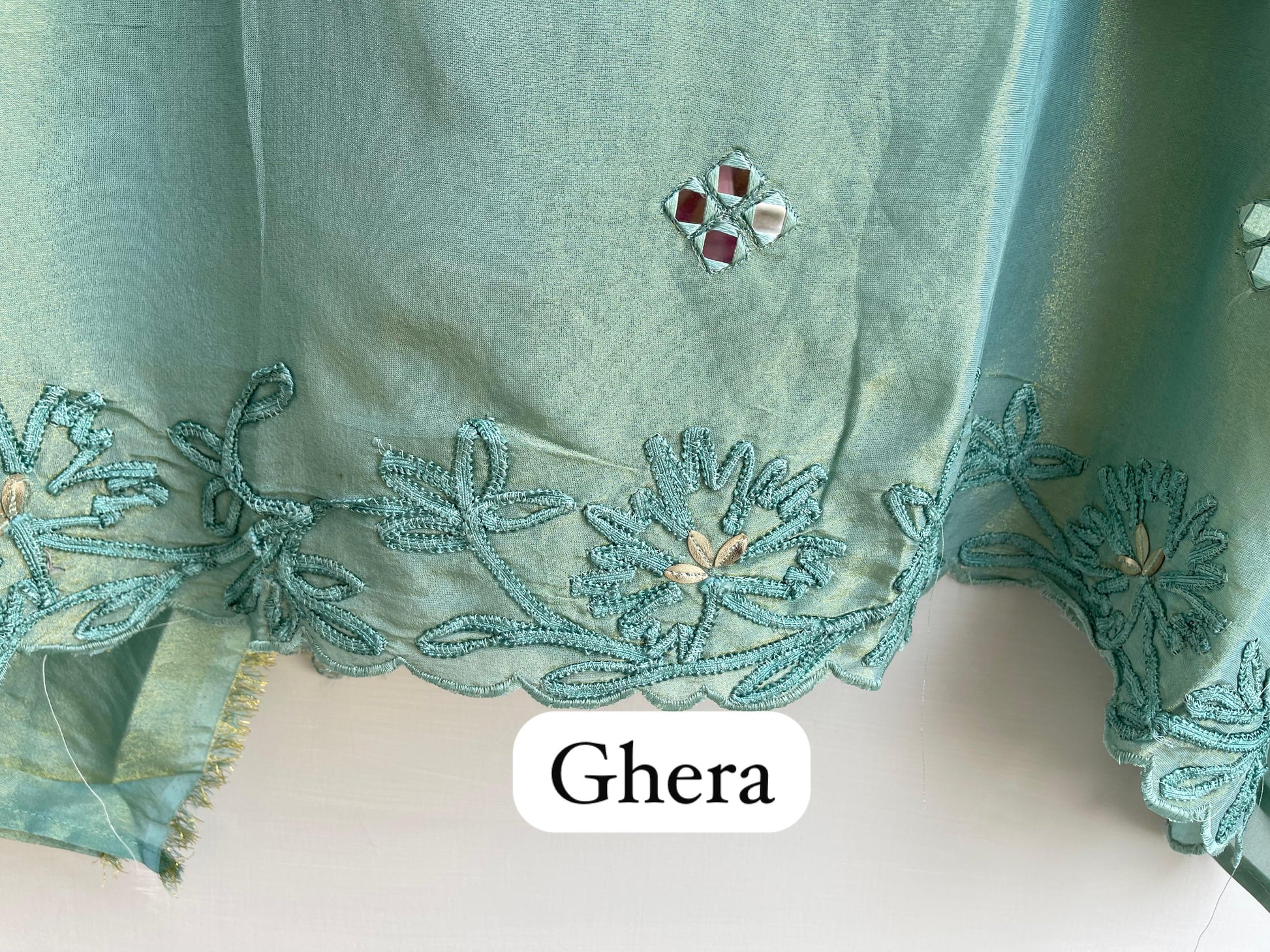 π shimmer silk fabric unstitched shirt with actual mirror leather work resham embroidery and scalping on ghera