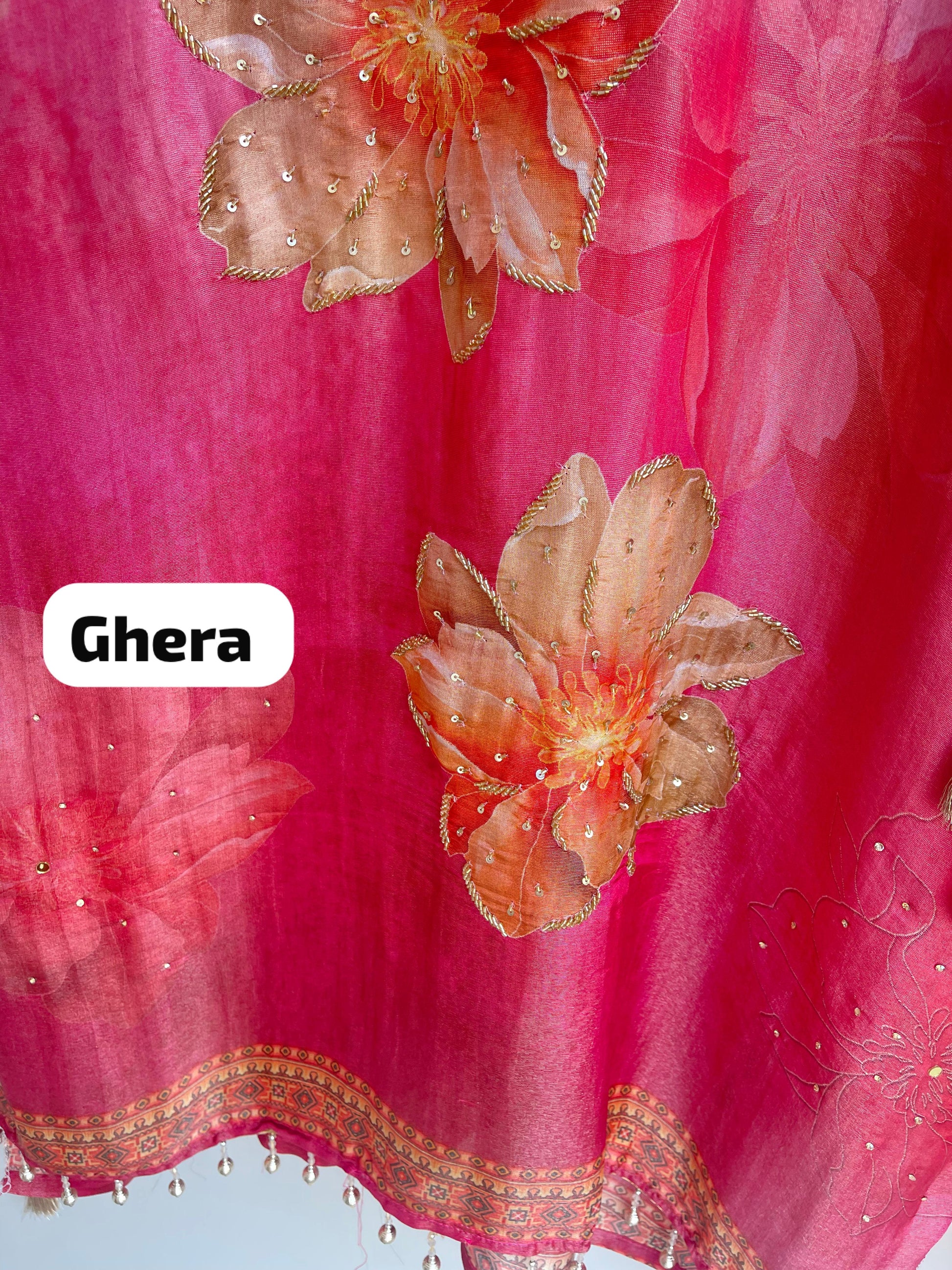 😊 shimmer silk printed fabric unstitched shirt with sequence kutdanna embroidery and pearl hanging ghera lace and swarowski highlighting