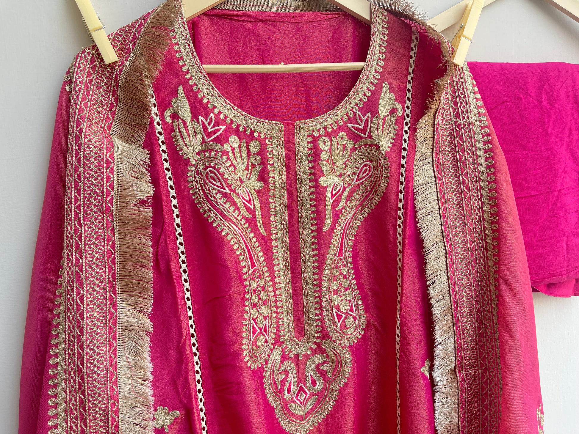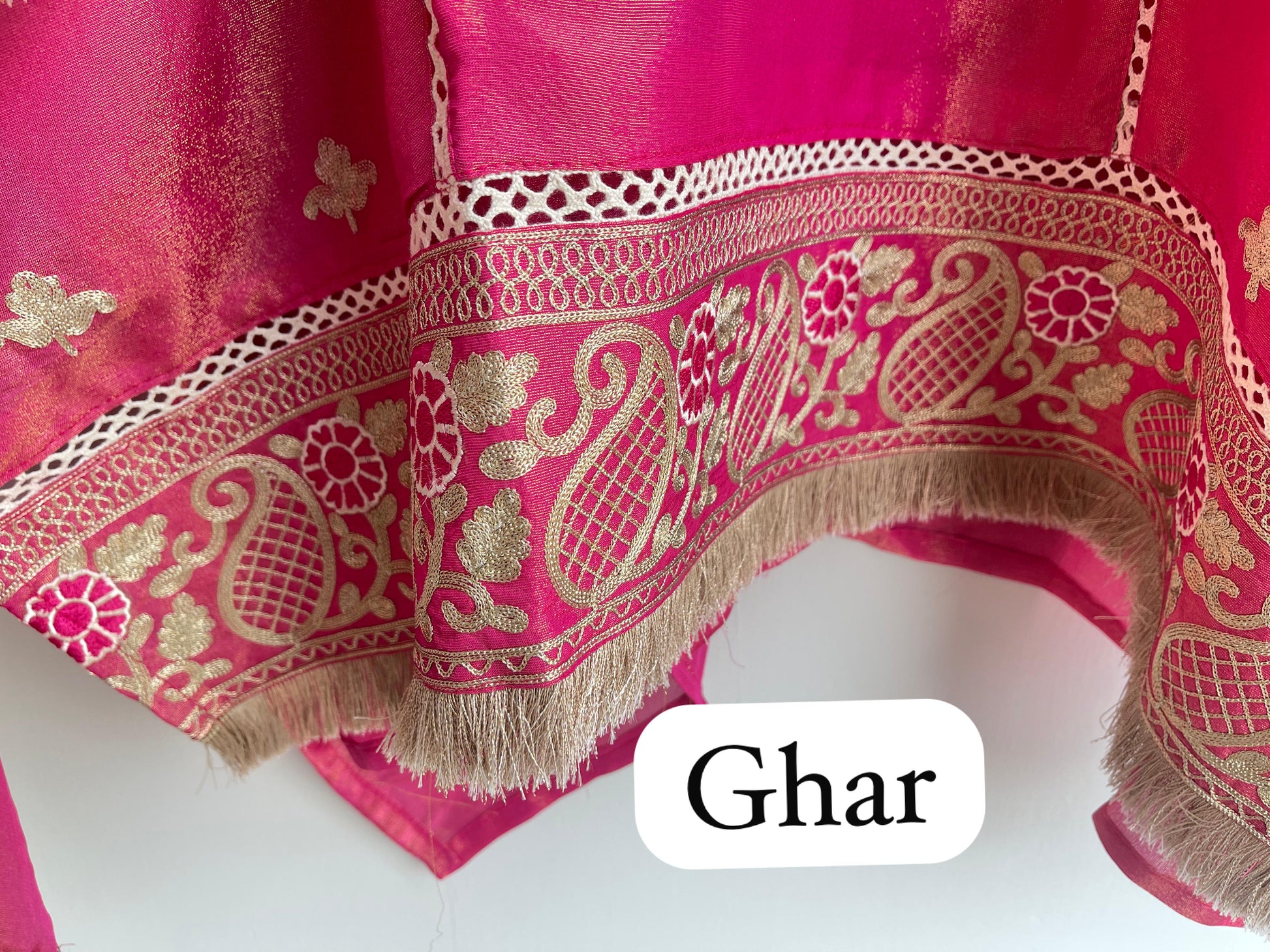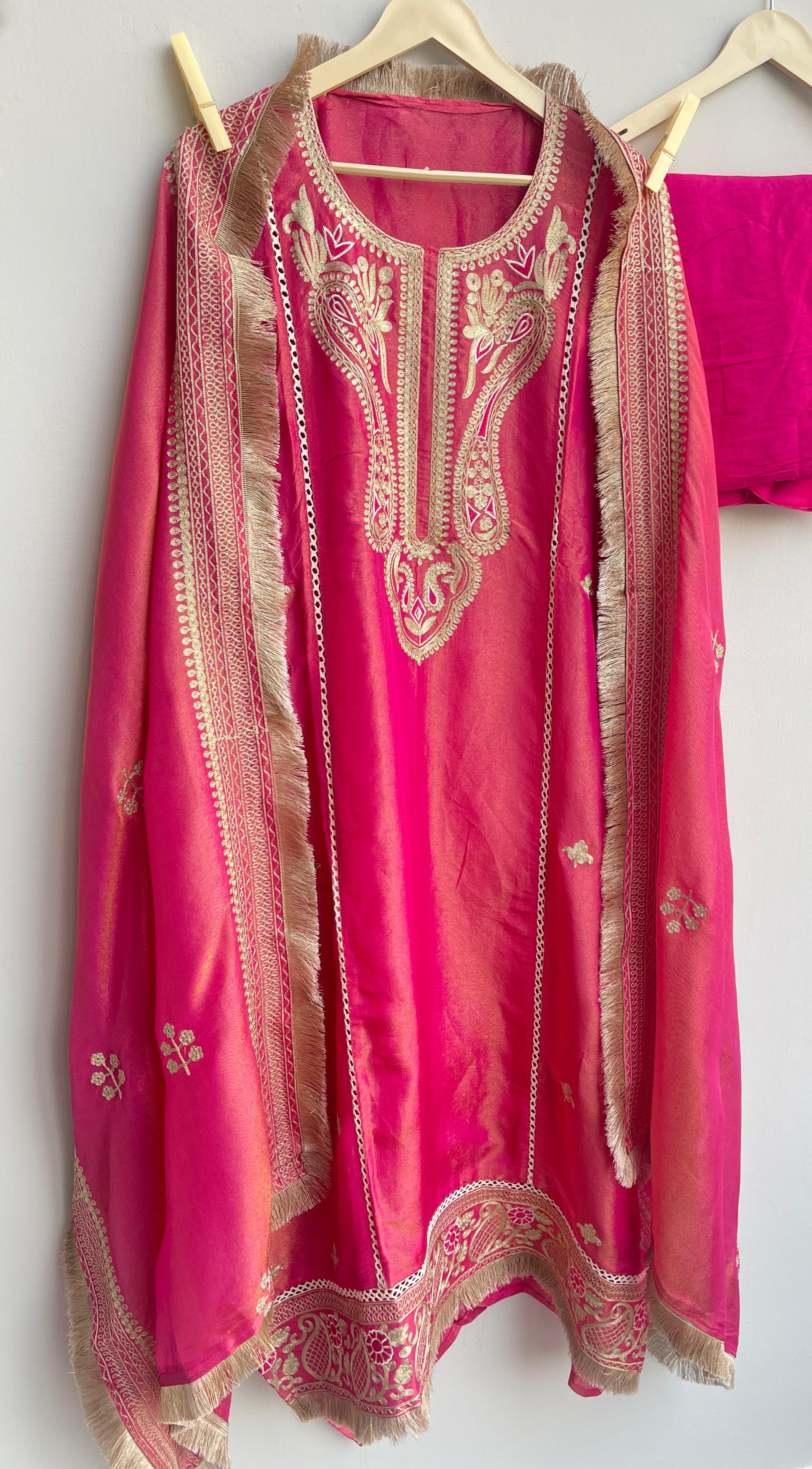 π shimmer silk fabric unstitched shirt with resham zari embroidery and crotia insertions and tassel ghera lace