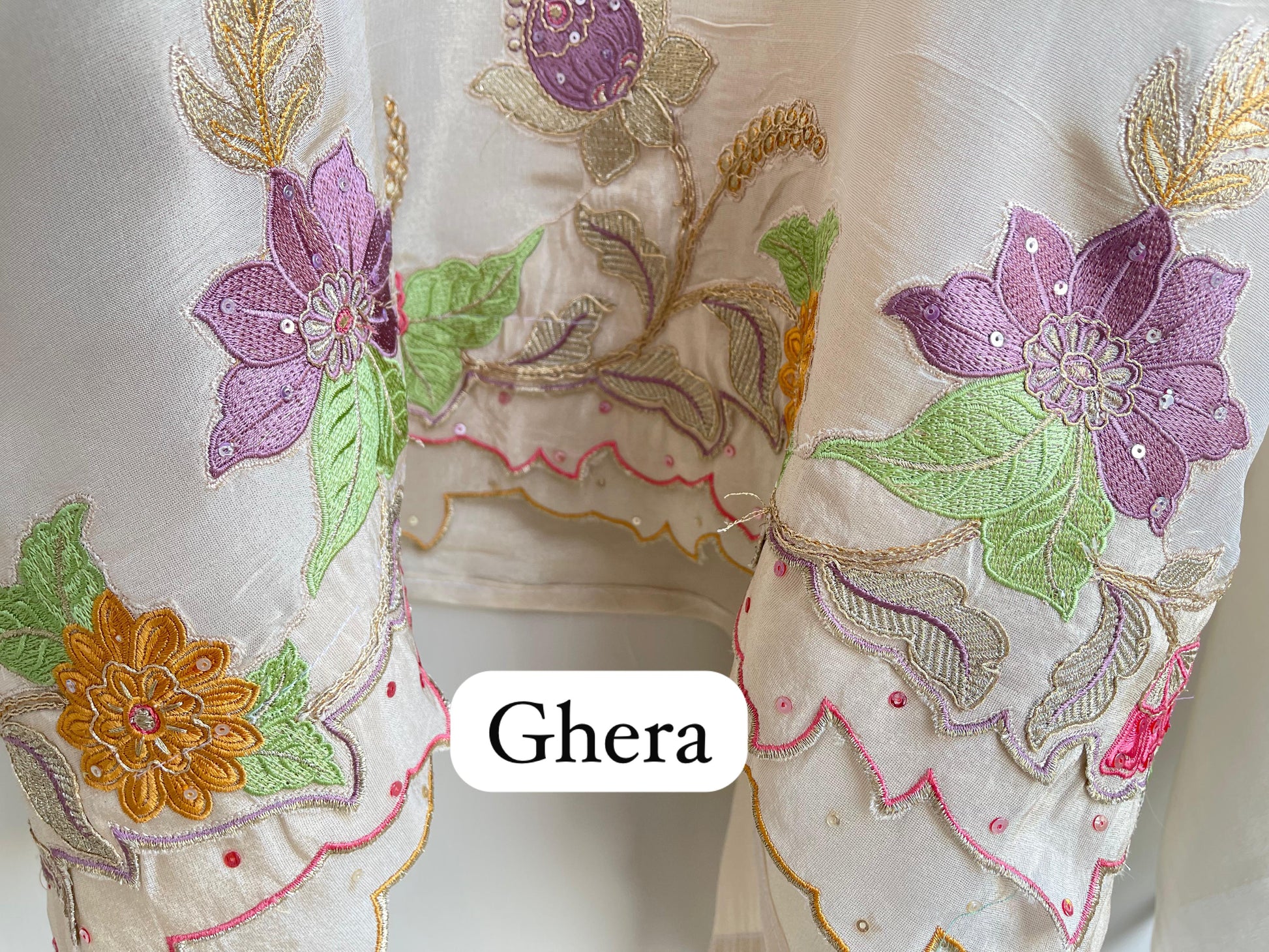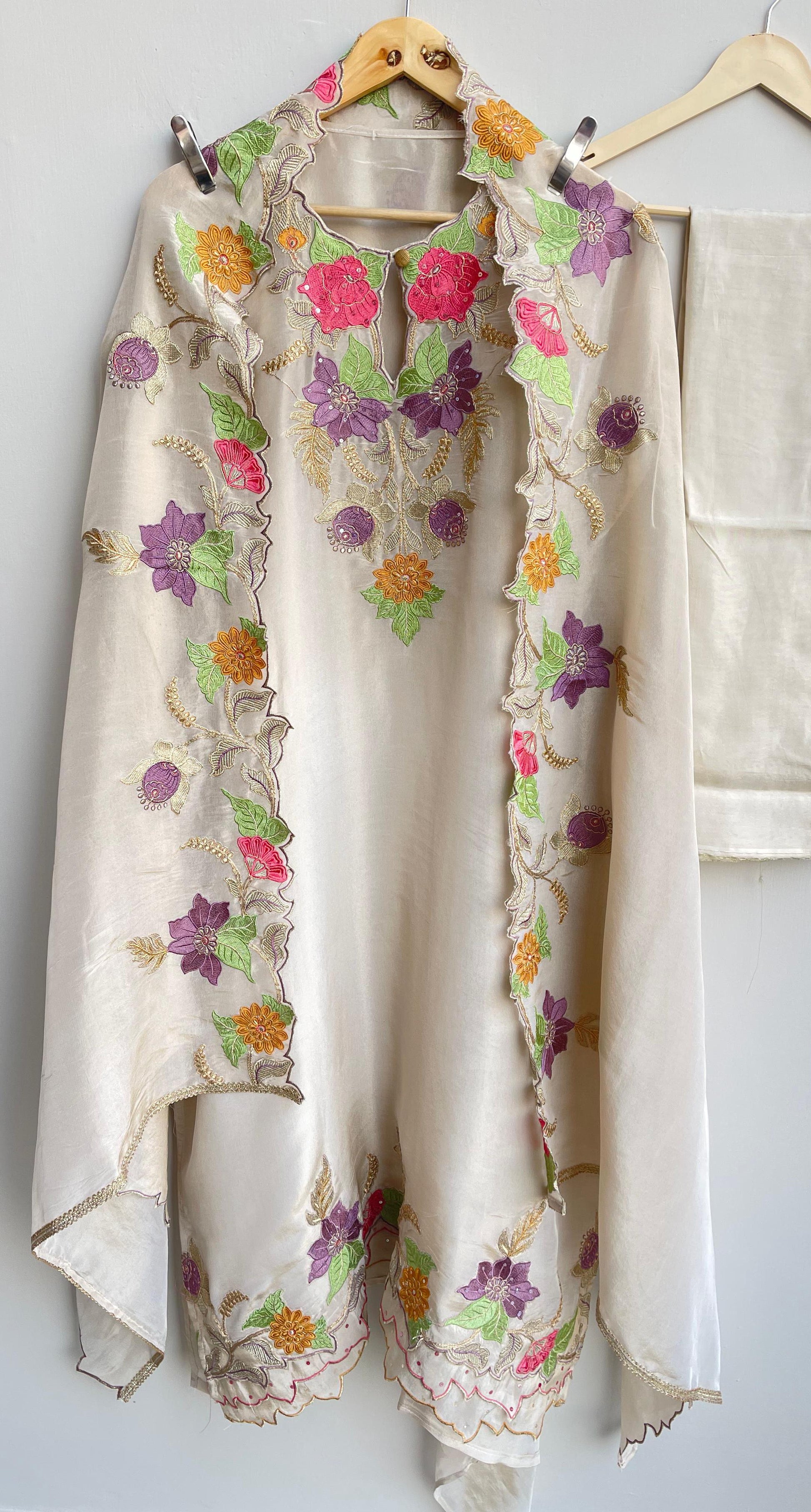 π pure shimmer silk fabric unstitched shirt with resham zari embroidery and sequence highlighting plus stunning cutwork on ghera