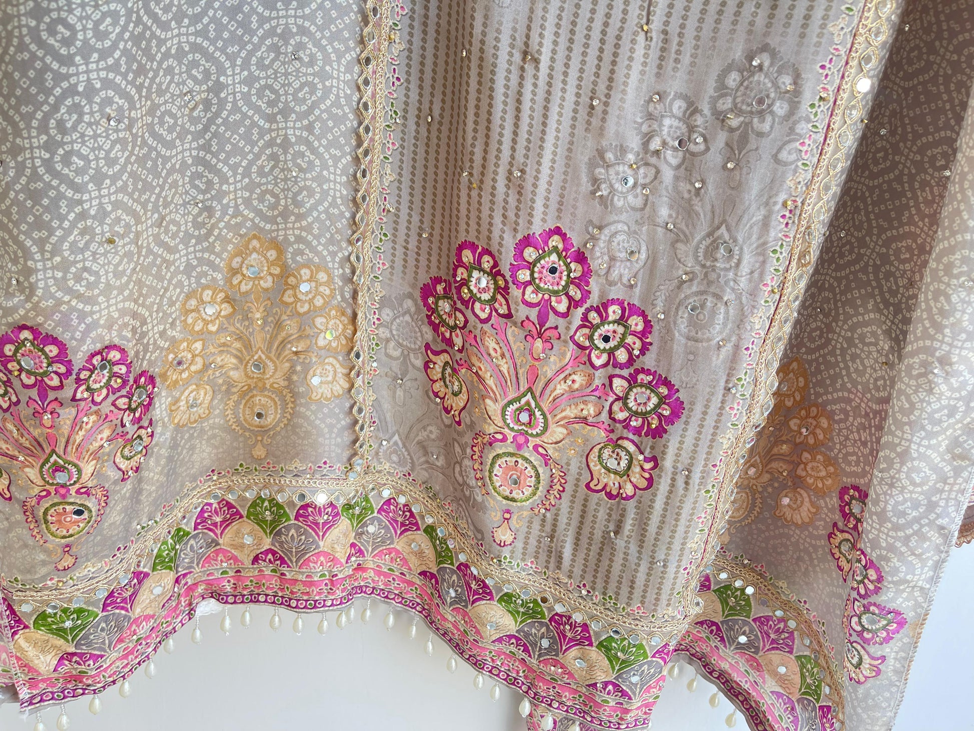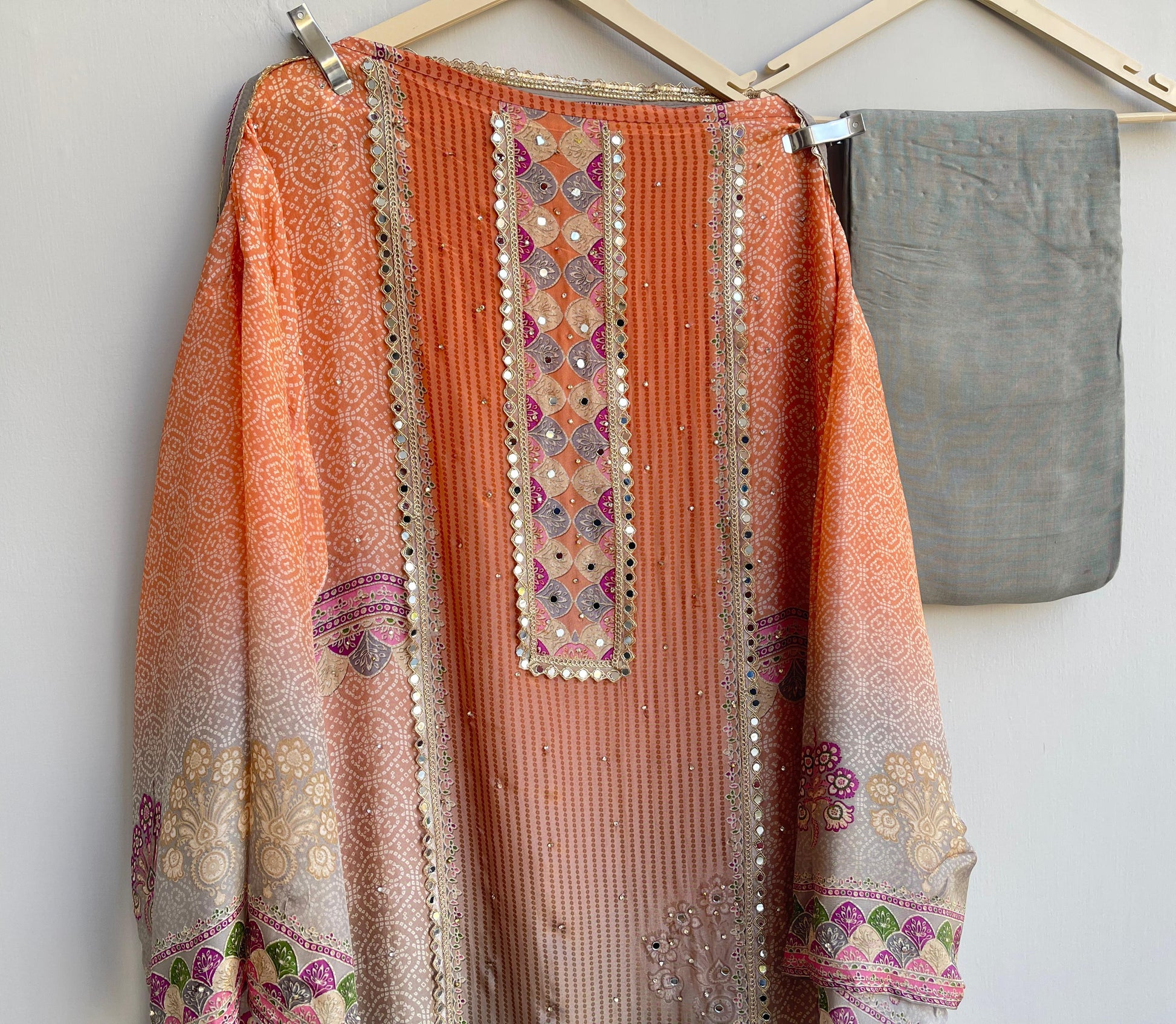 😊 shimmer silk printed fabric unstitched shirt with mirror work pearl lace embroidery
