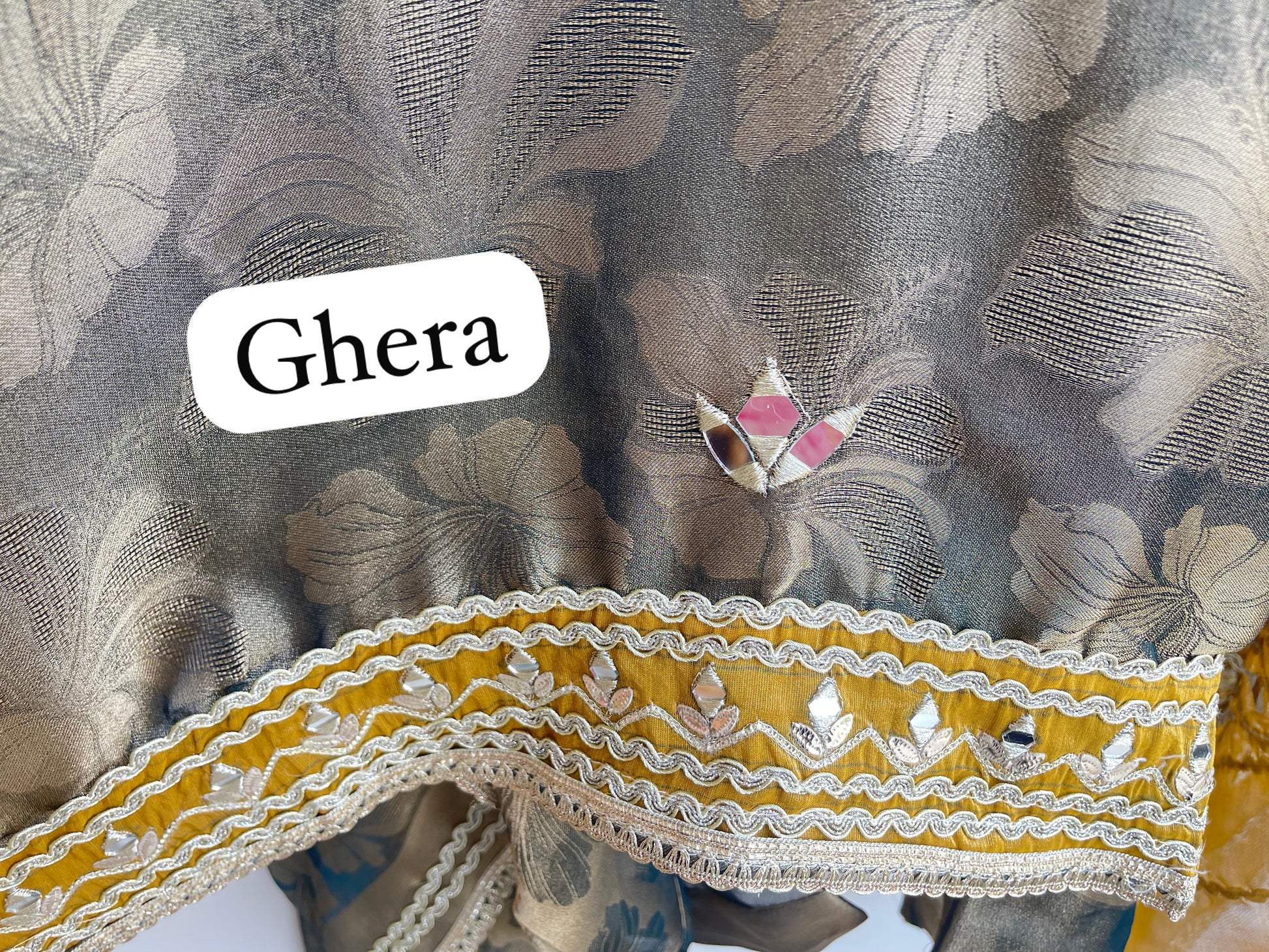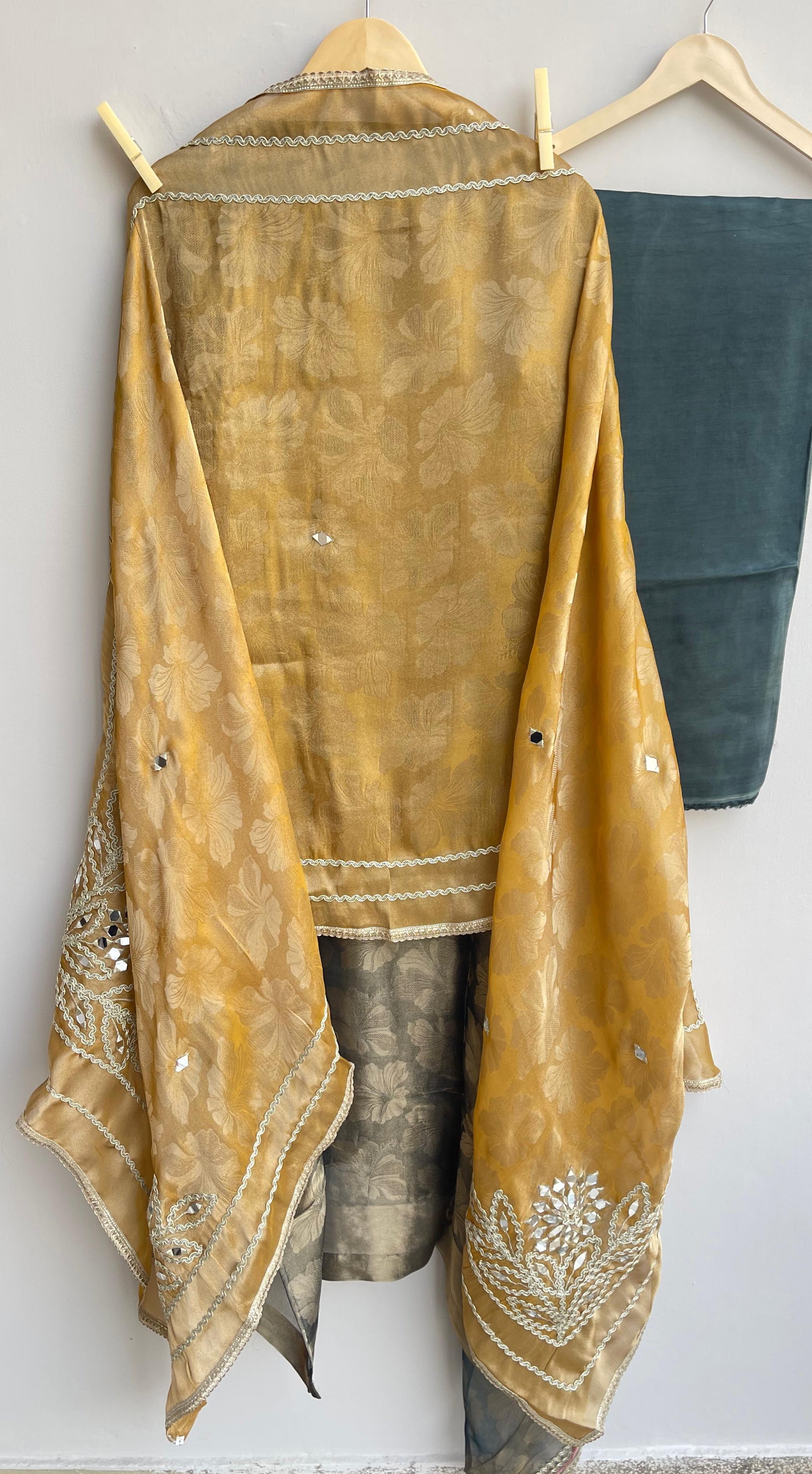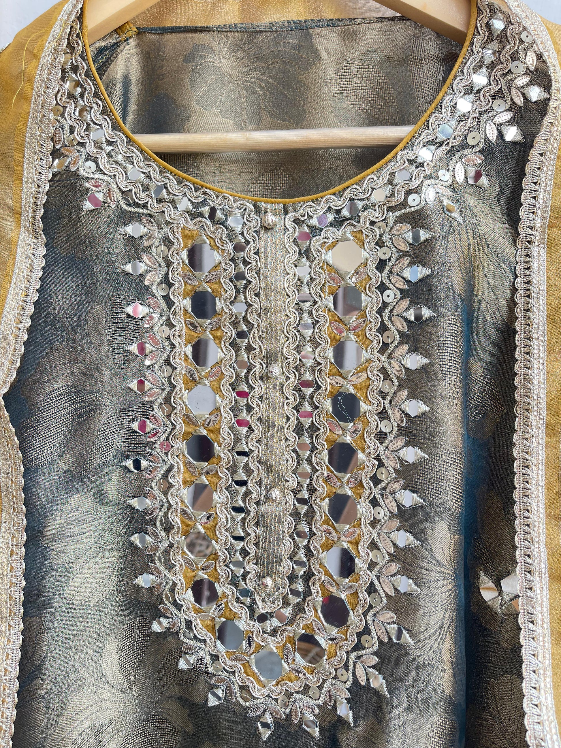 π pure self shimmer silk fabric unstitched shirt with actual mirror work and zari embroidery and ghera lace