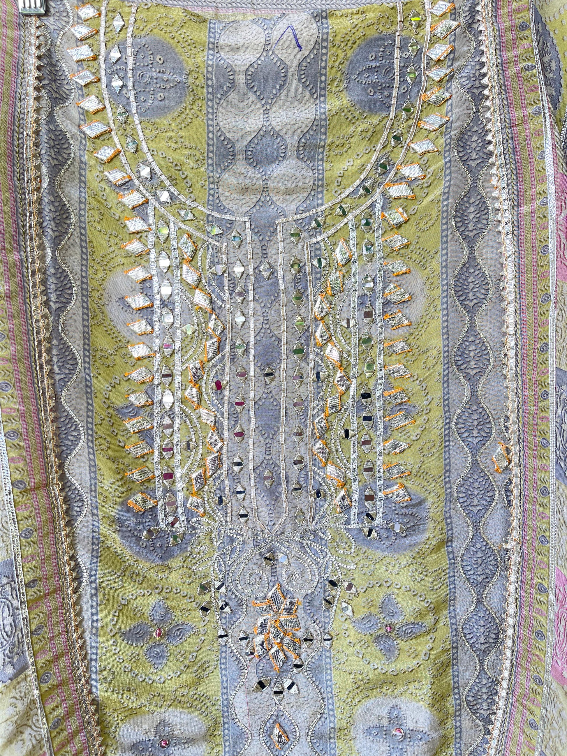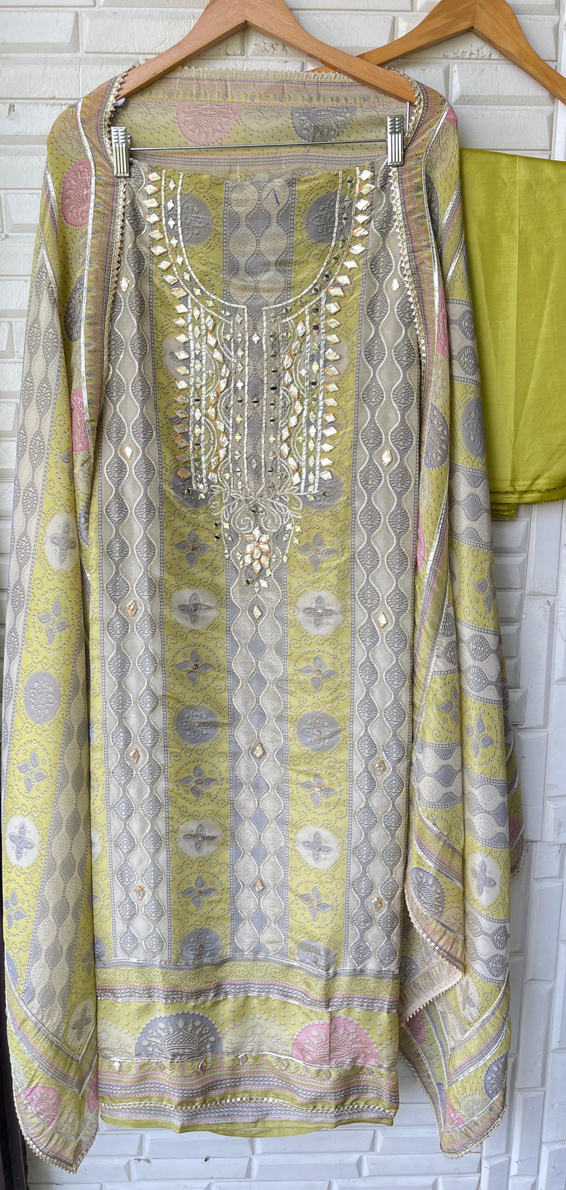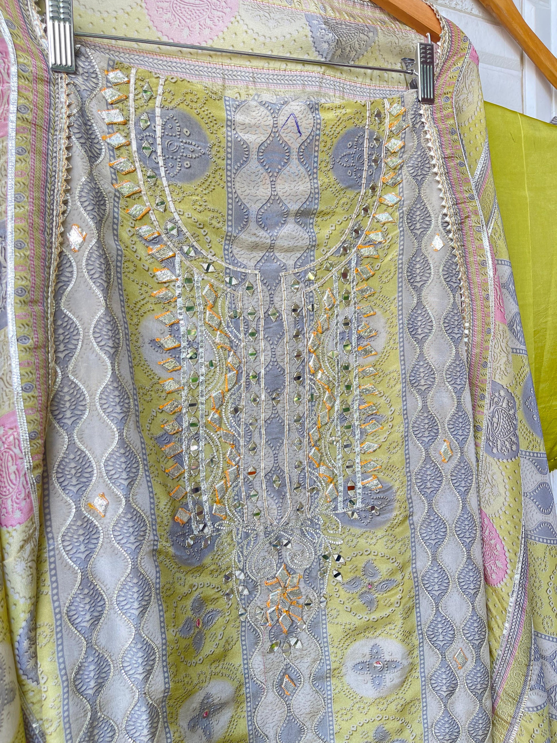 😊 shimmer tassar silk printed fabric unstitched shirt with gotta patti actual mirror work resham embroidery