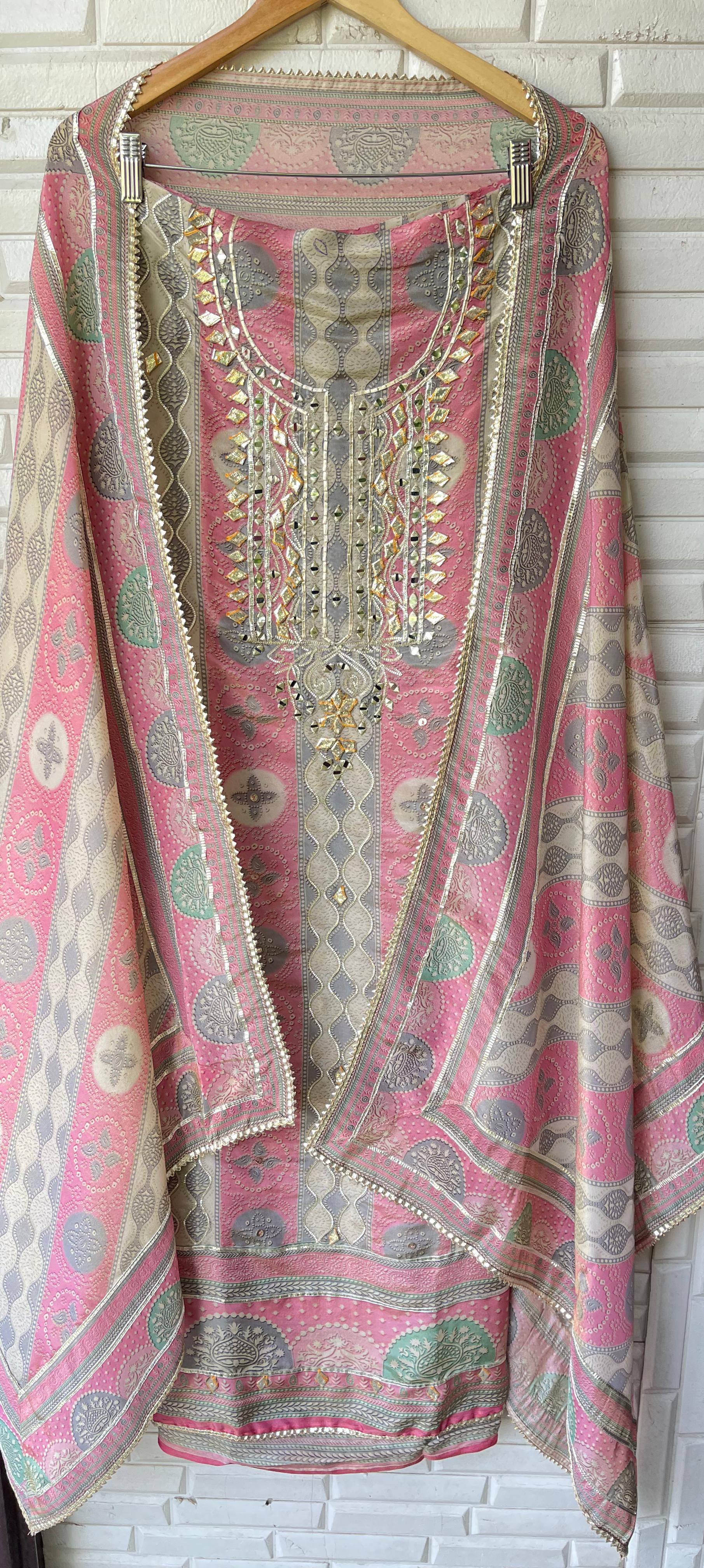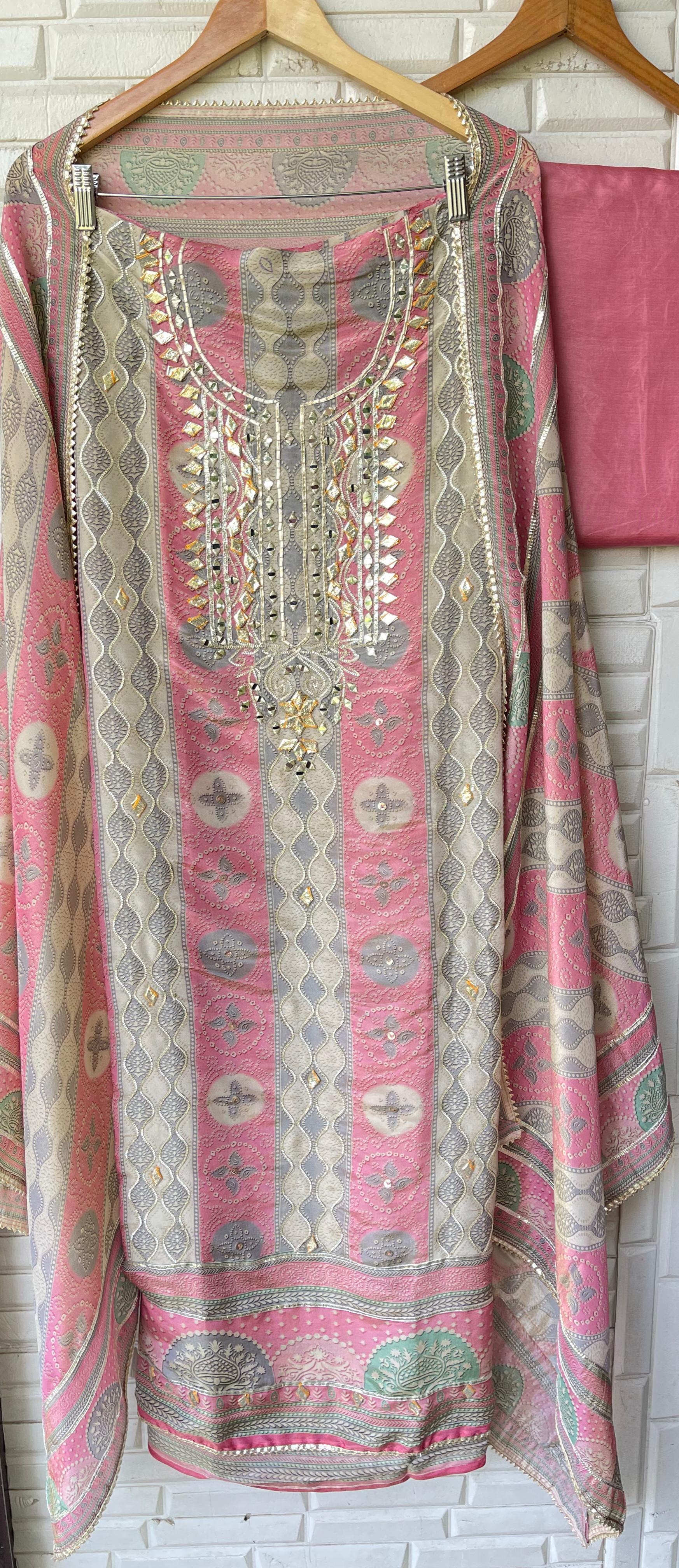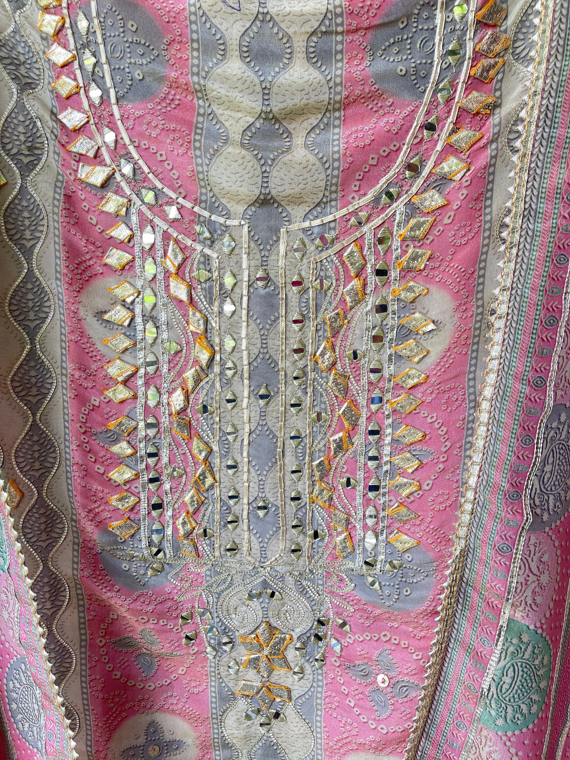 ๐ shimmer tassar silk printed fabric unstitched shirt with gotta patti actual mirror work resham embroidery