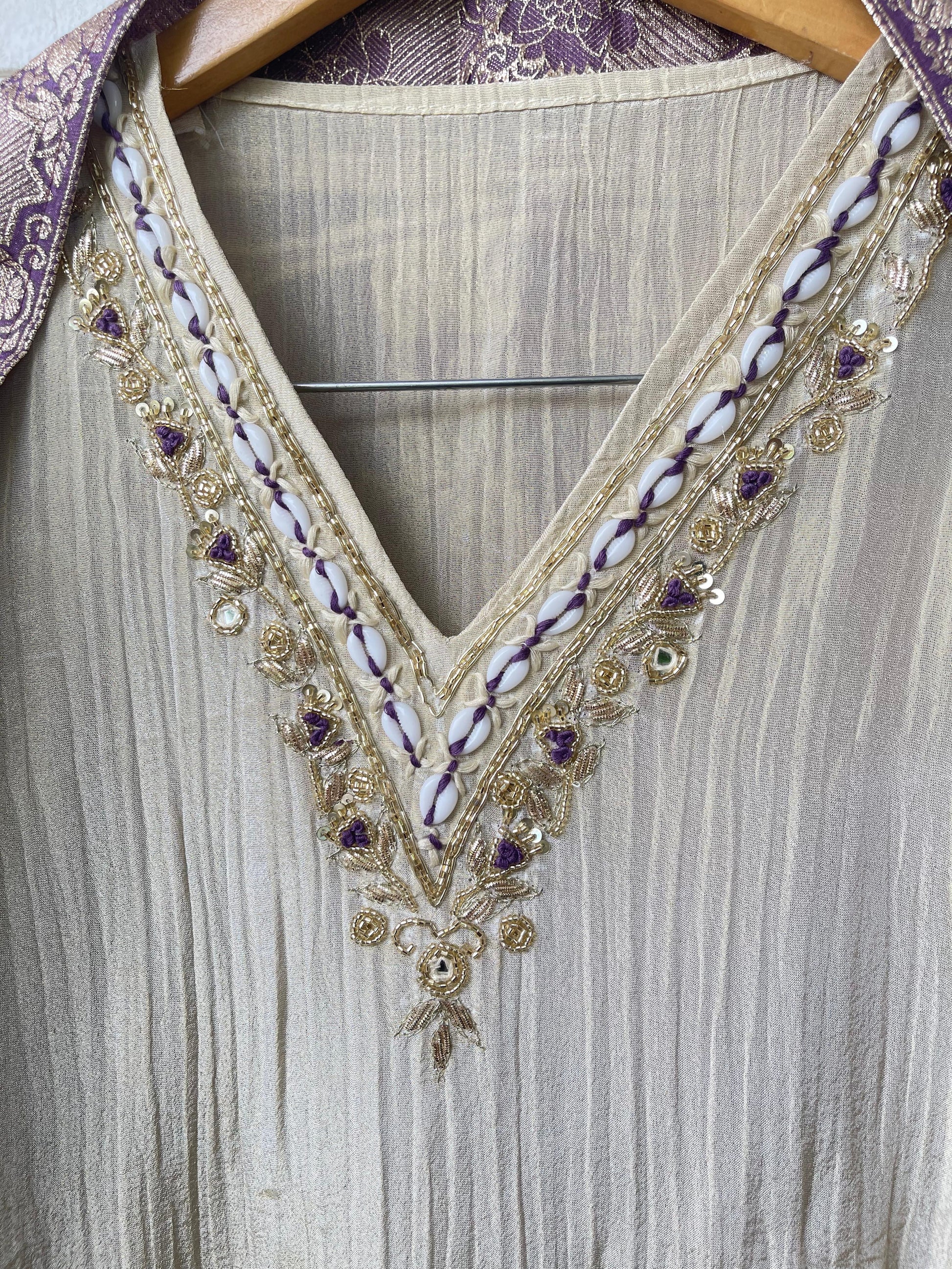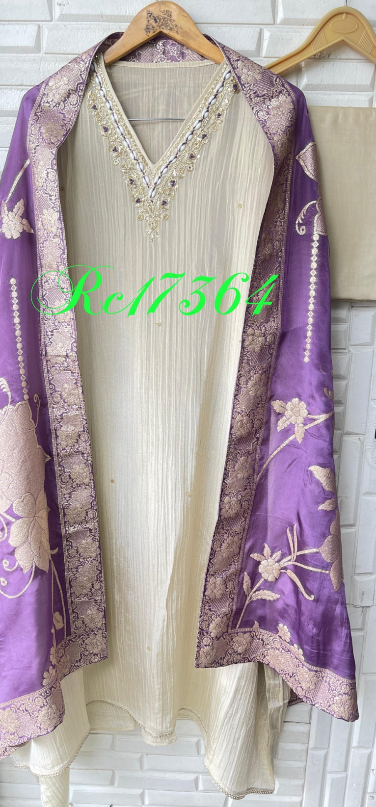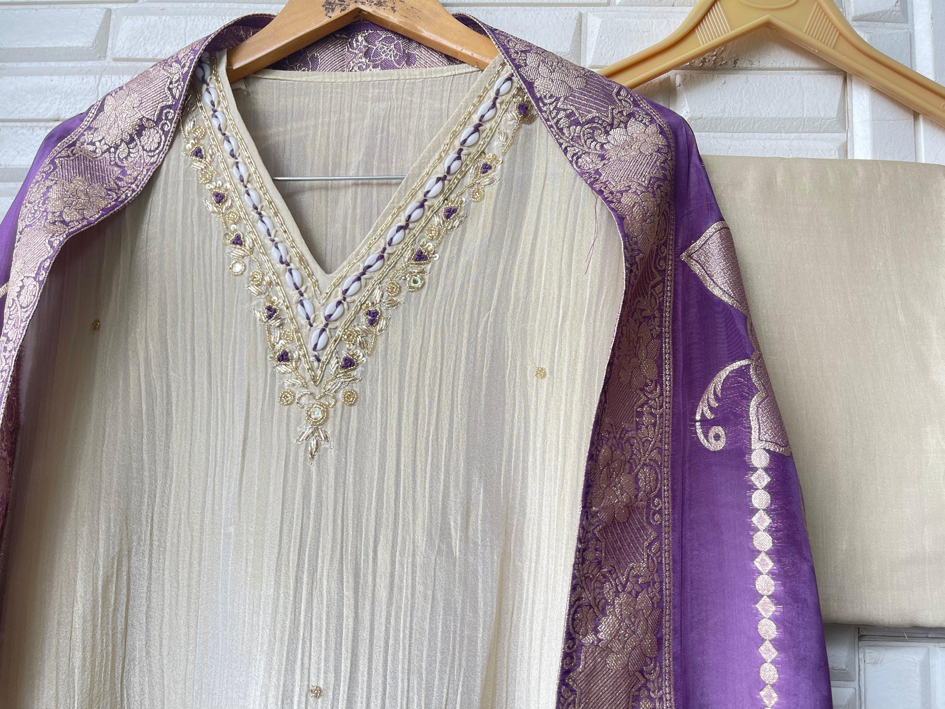 😊 crushed shimmer tissue fabric unstitched shirt with pearl shells zari dabka sequence resham embroidery