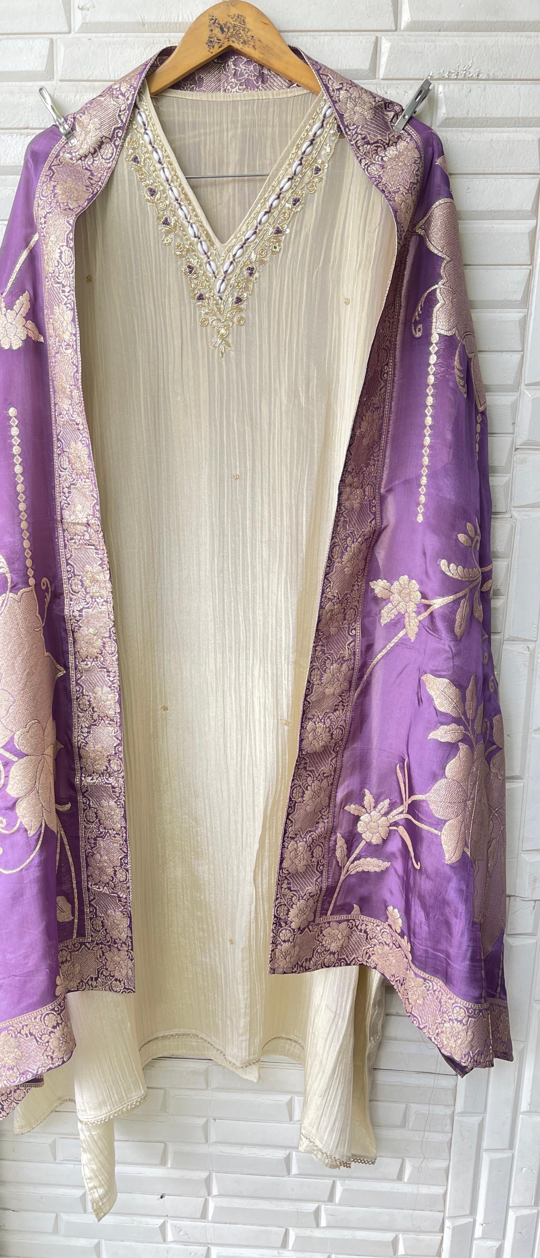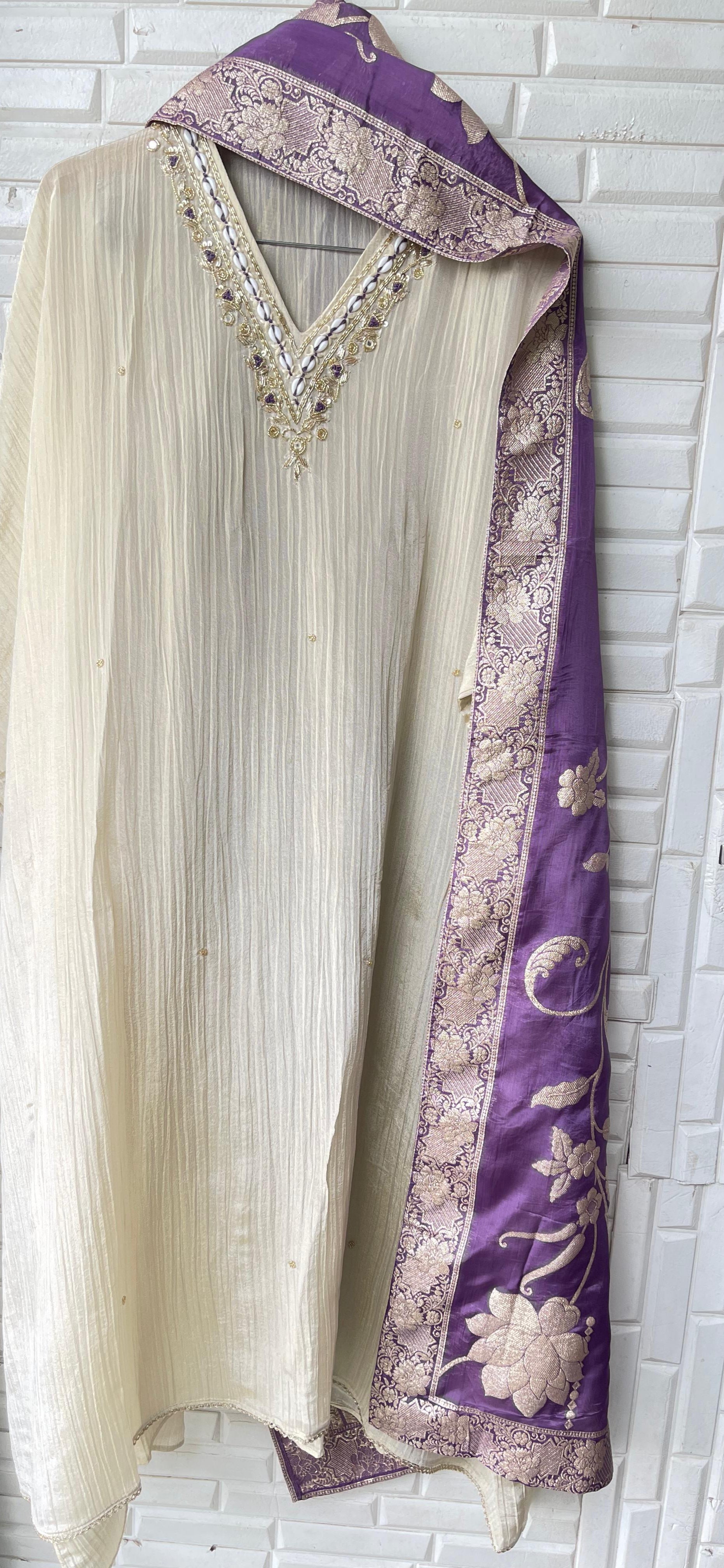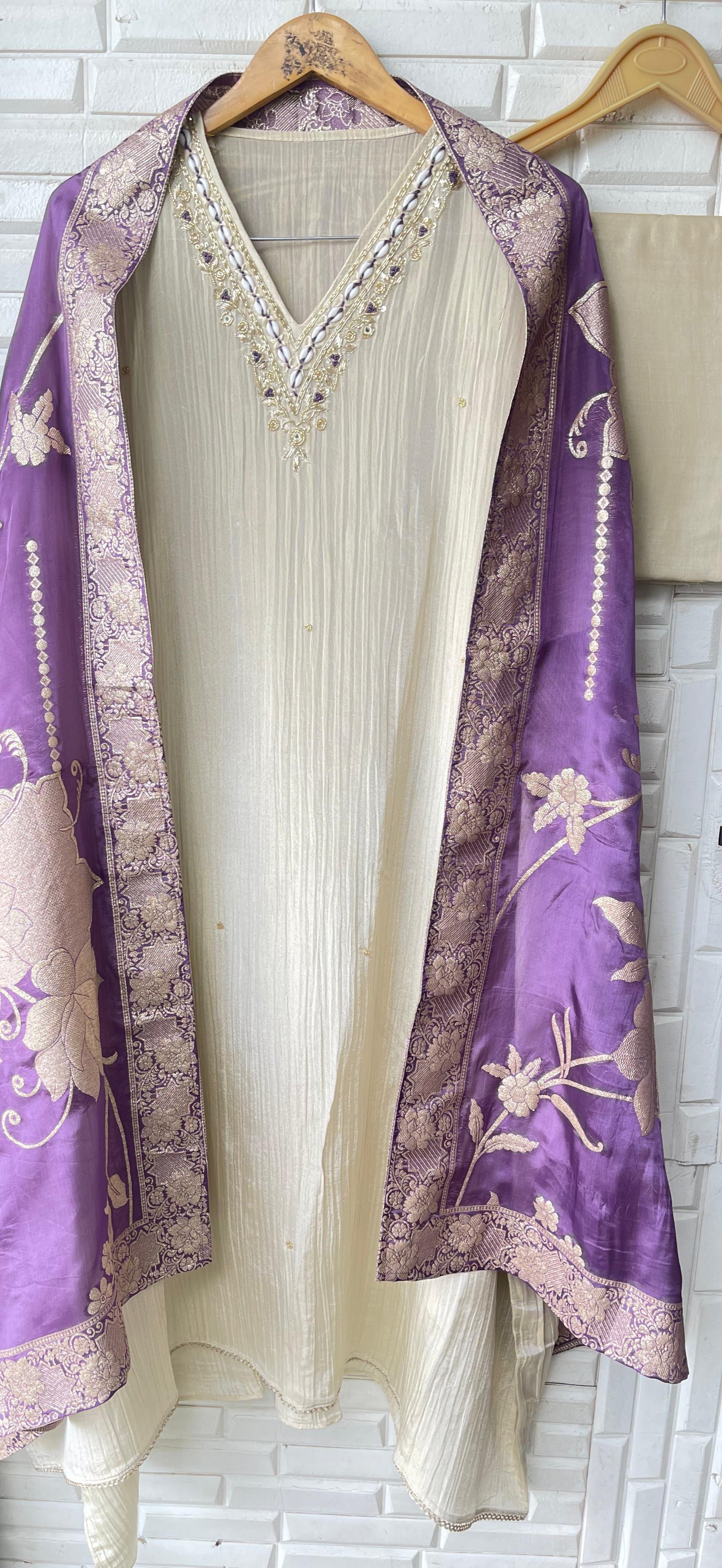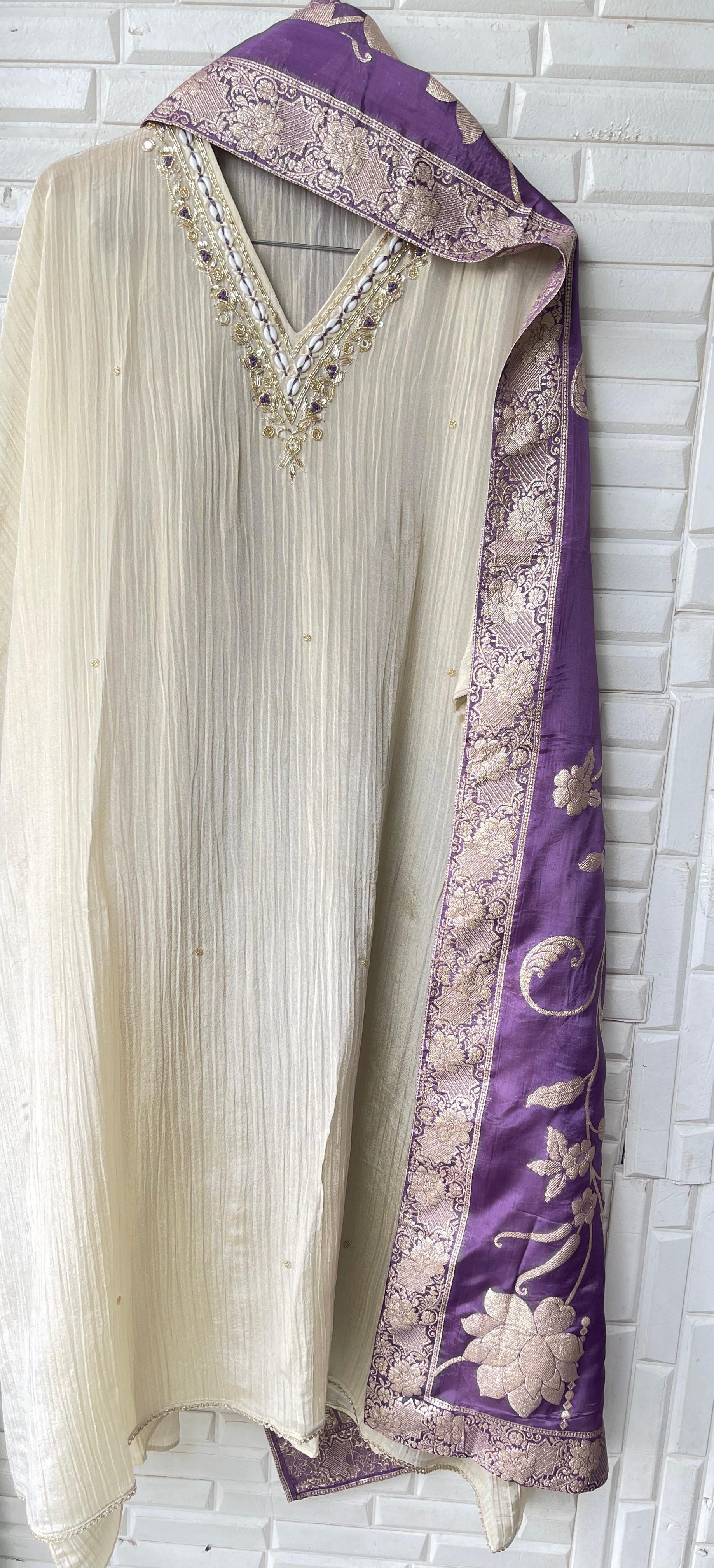😊 crushed shimmer tissue fabric unstitched shirt with pearl shells zari dabka sequence resham embroidery