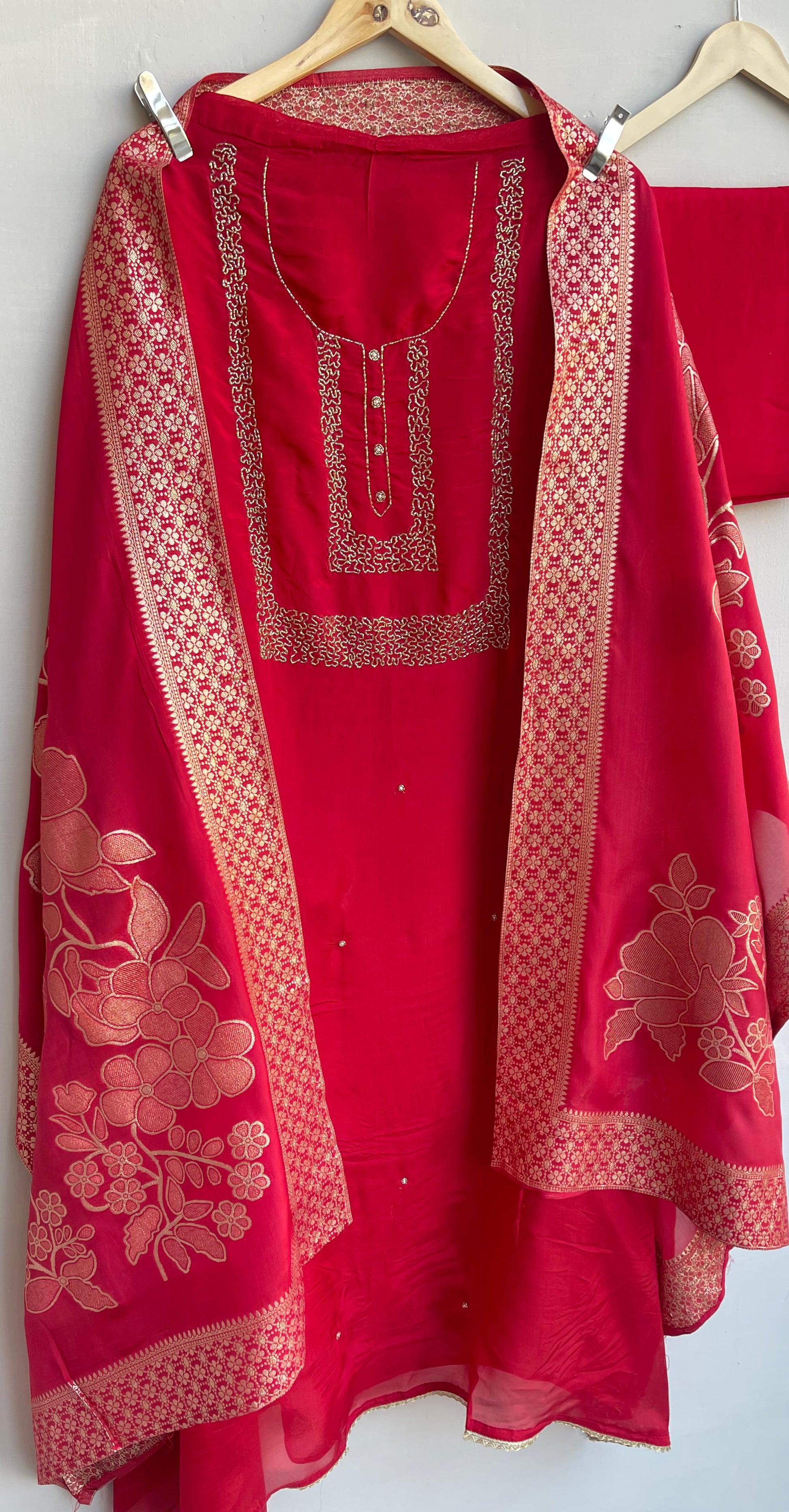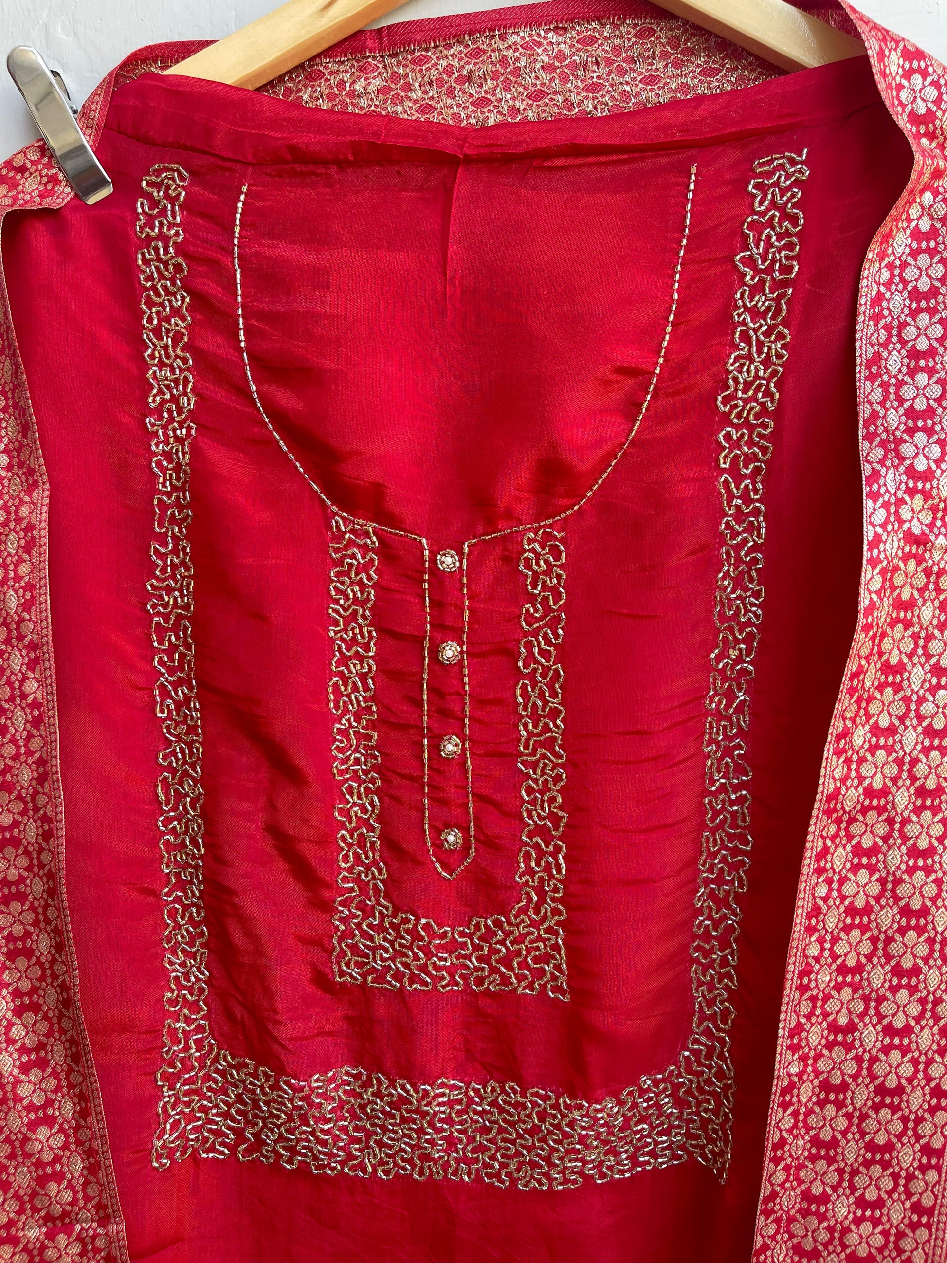π silk organza fabric unstitched shirt with kutdanna pearl hand embroidery and ghera border lace