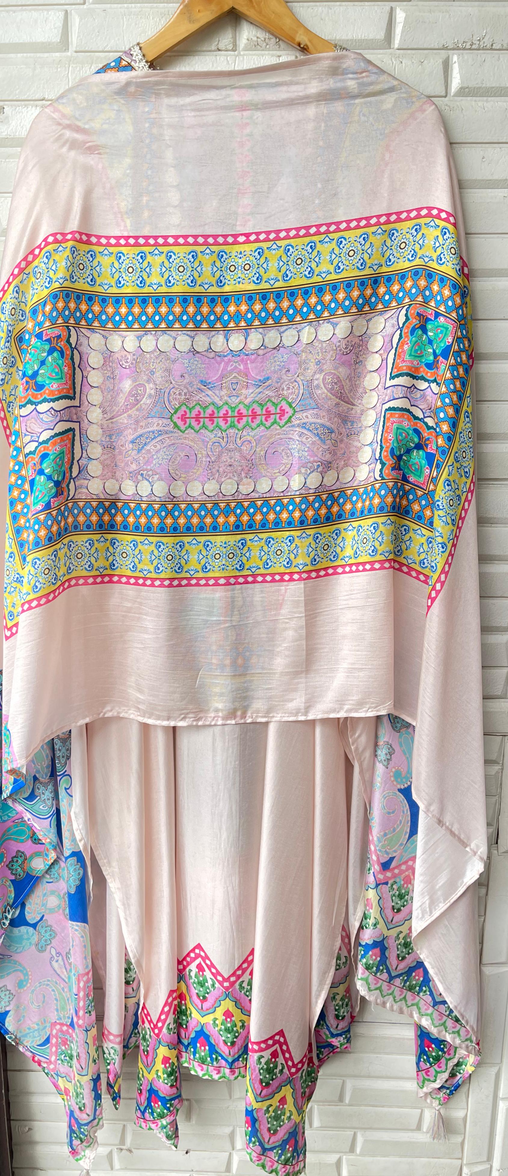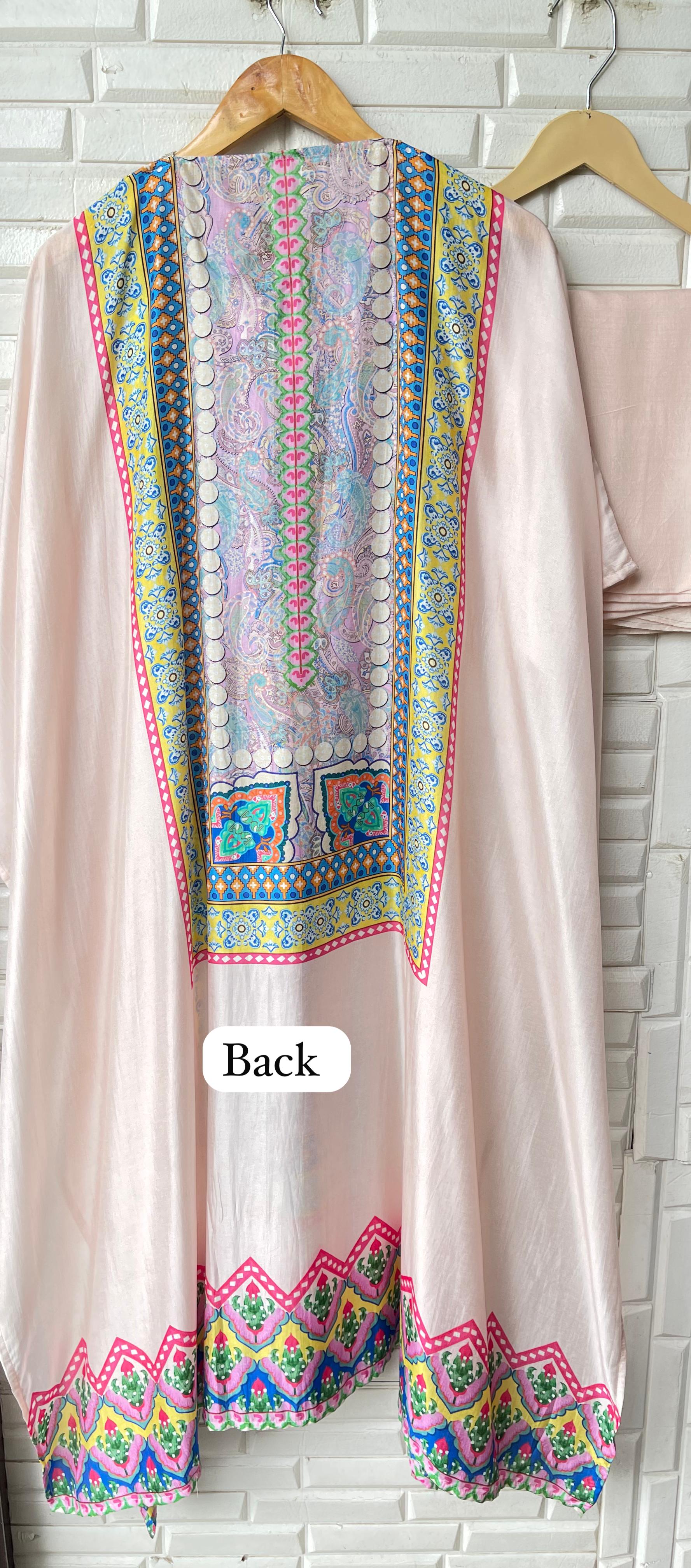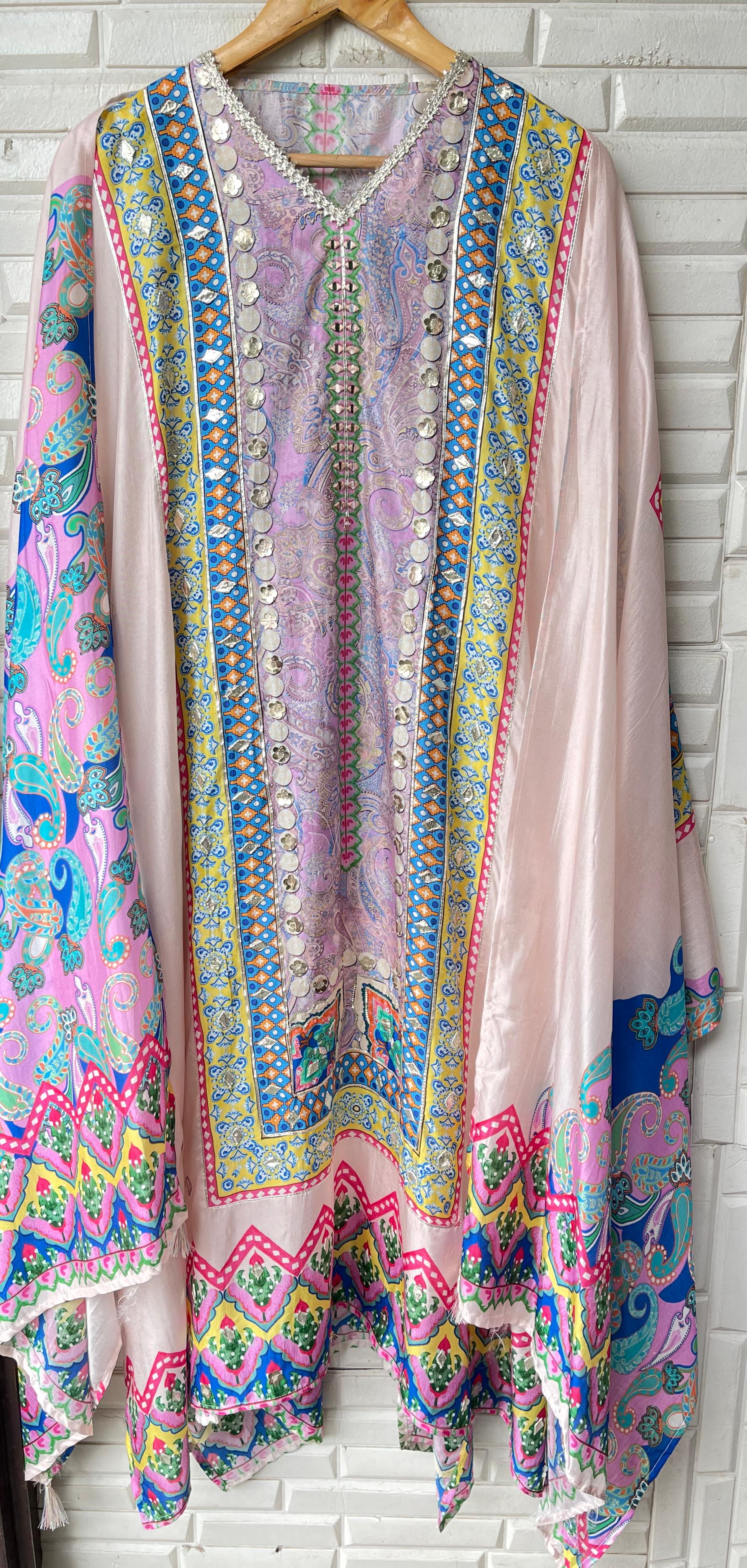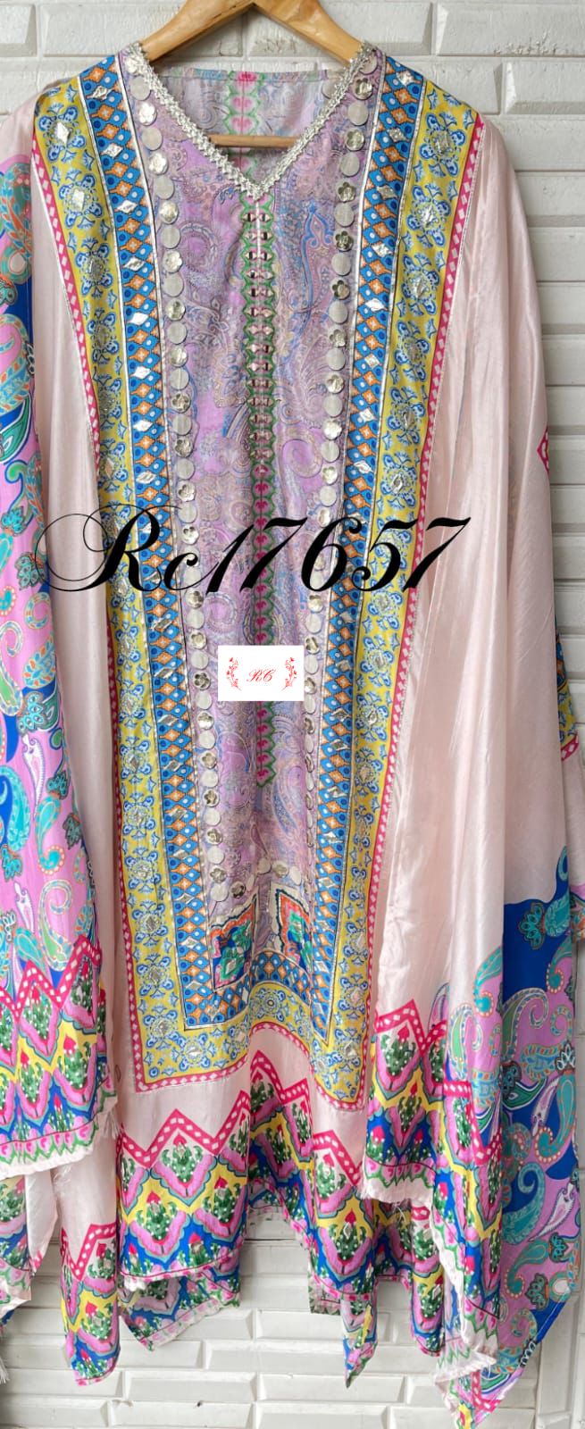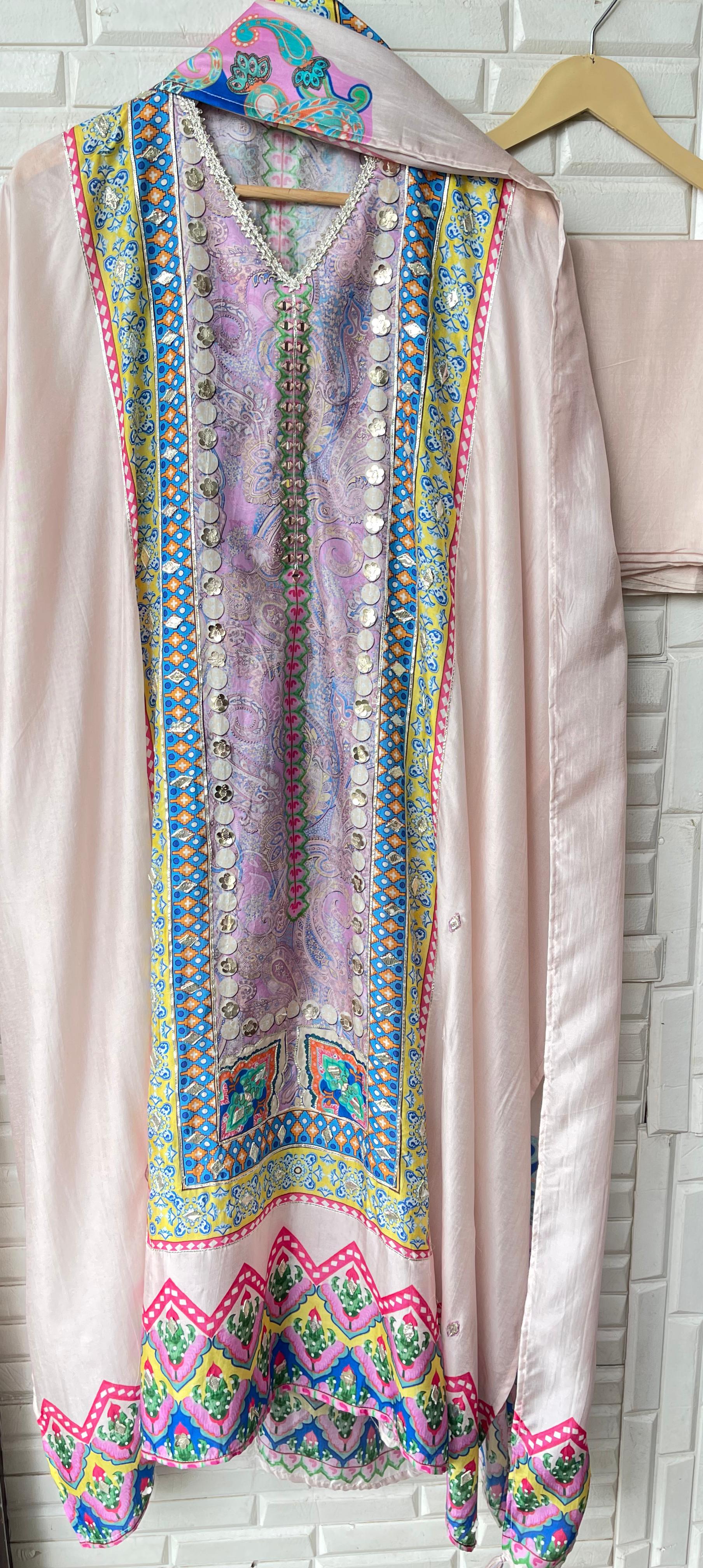 π pure silk printed fabric unstitched shirt with gotta work leather patch work plus actual mirror zari embroidery