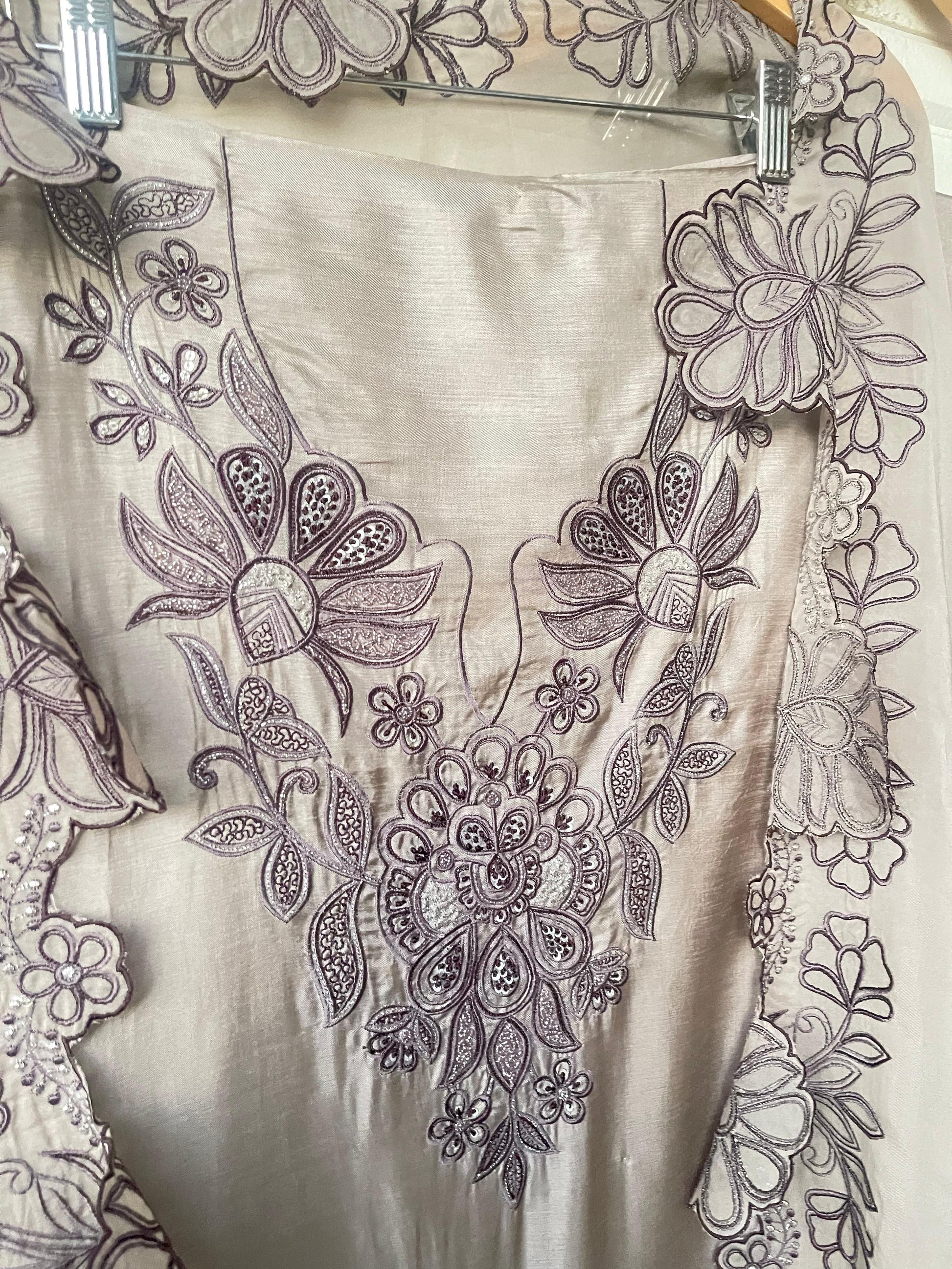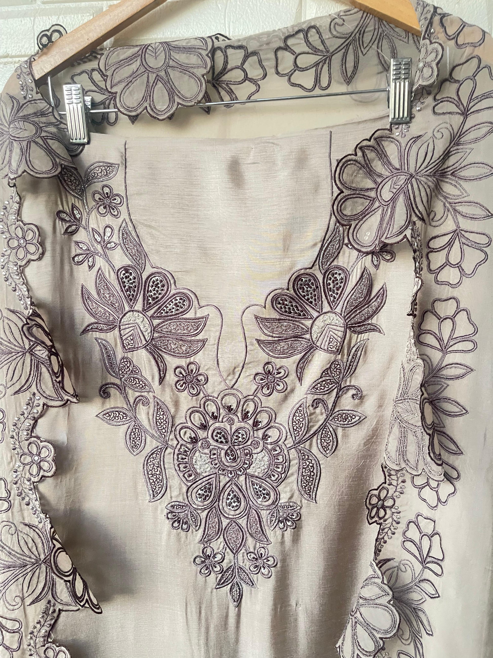 π silk fabric unstitched shirt with zari resham embroidery and ghera lace