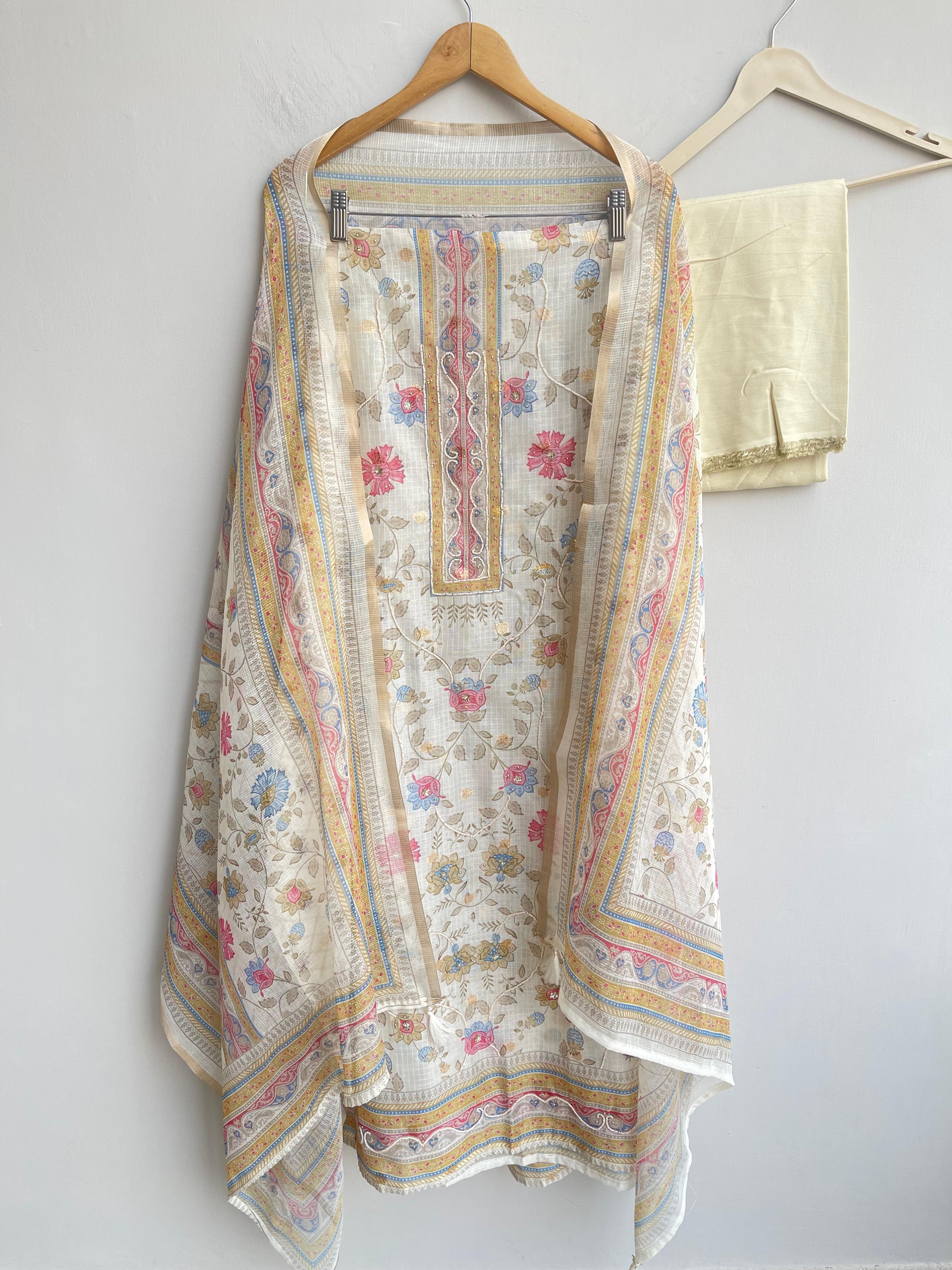😊 soft banarasi kota doriya printed fabric unstitched shirt with kutdanna embroidery and pearl highlighting