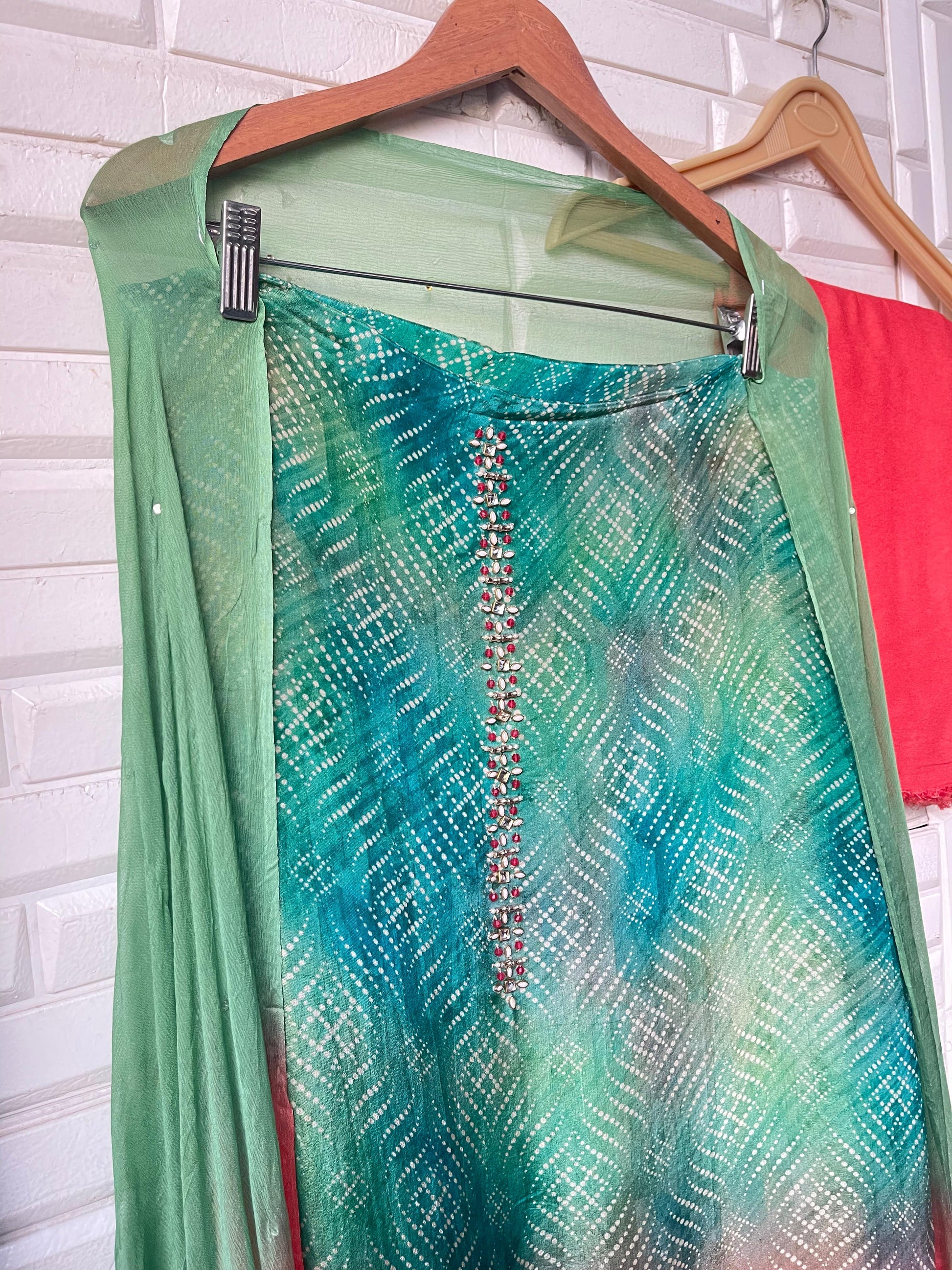 π tissue shimmer silk bhandani printed fabric unstitched shirt with kundan pearl swarowski sequence kutdanna embroidery and pearl hanging ghera lace and brocade borders