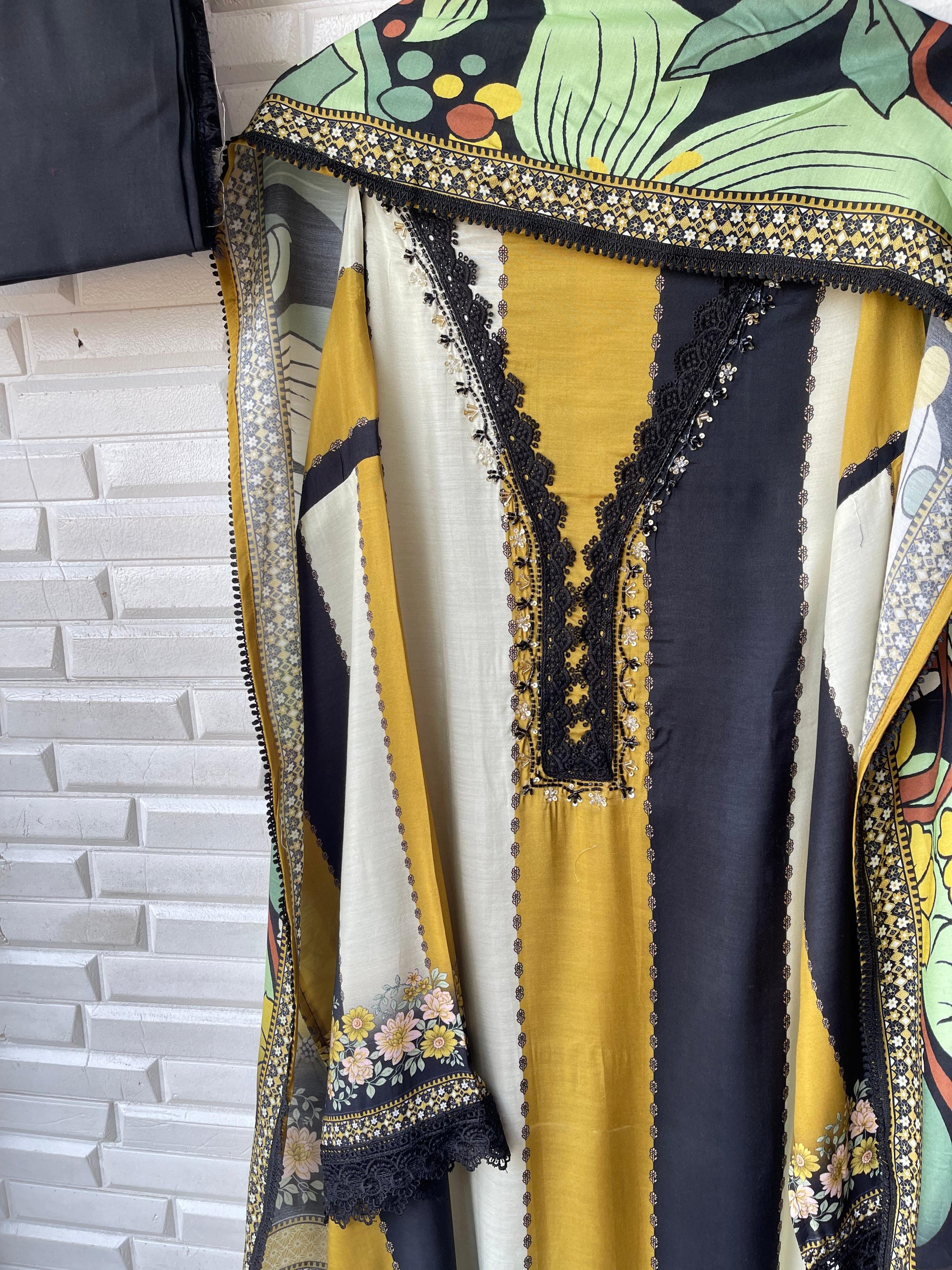 😊 muslin silk printed fabric unstitched shirt with kutdanna sequence resham pearl embroidery and crotia lace
