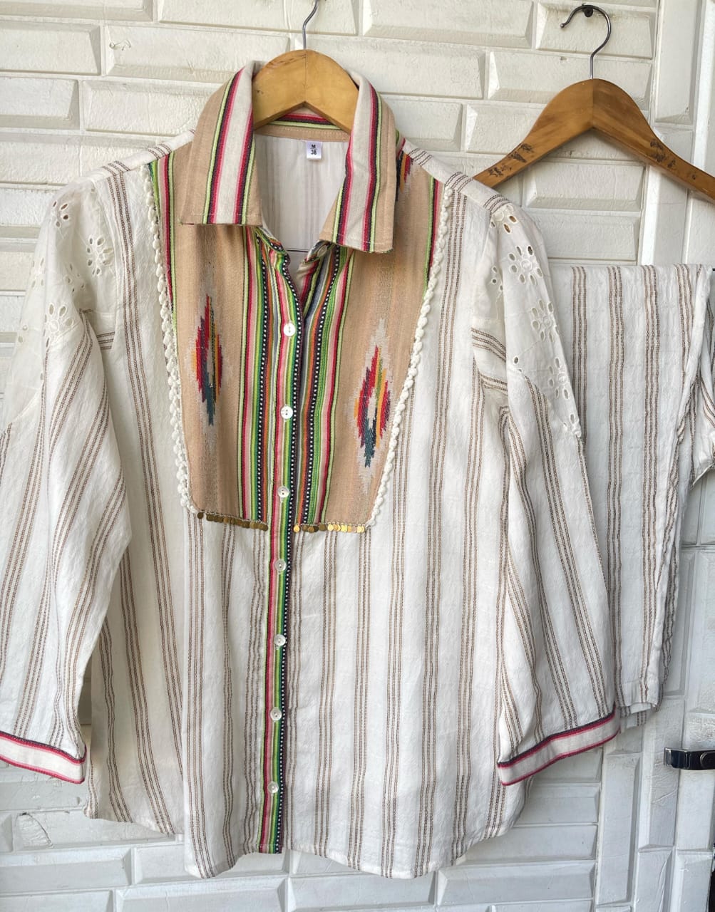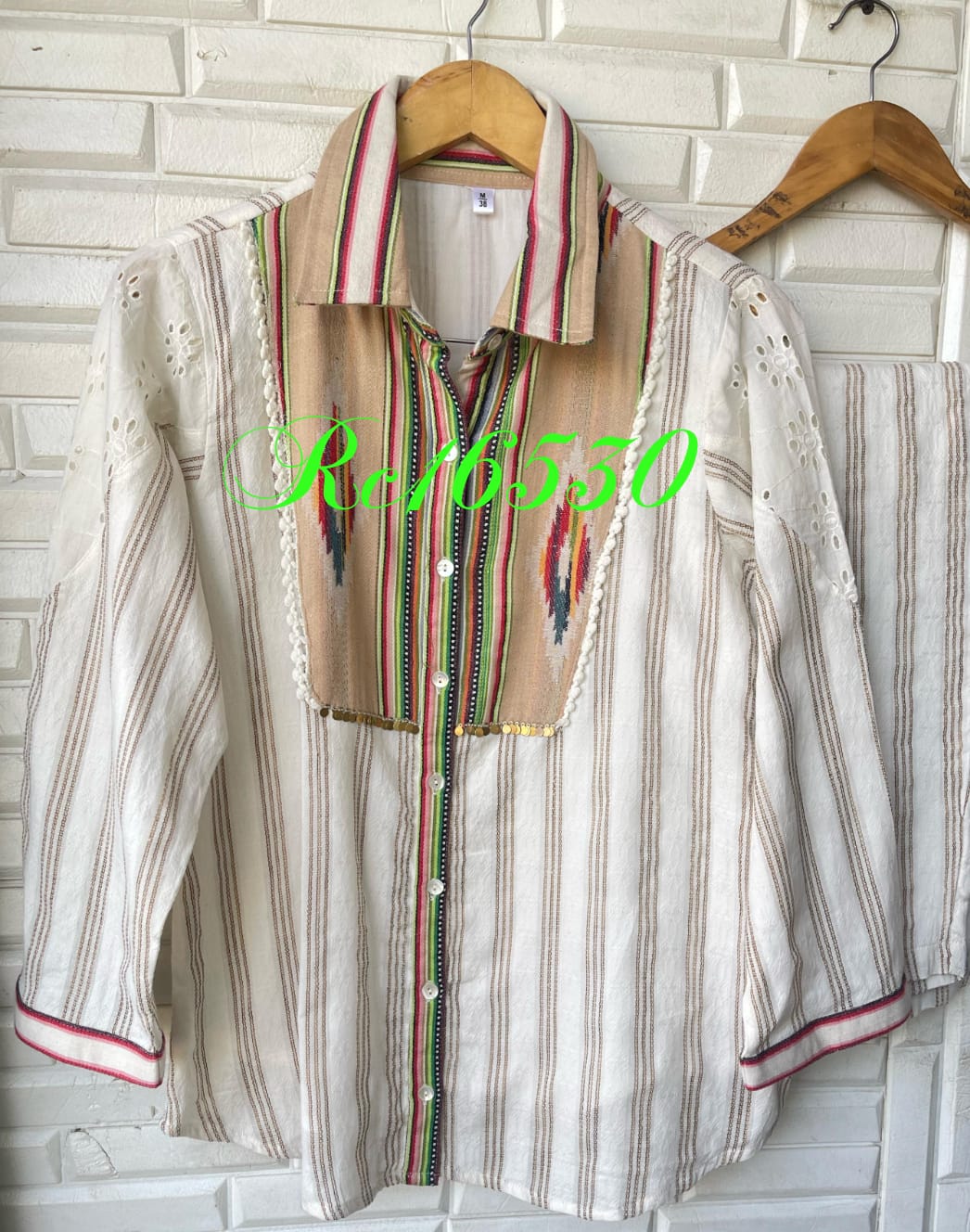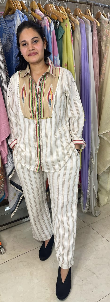 😊 self linen cotton fabric stitched coord set shirt with resham embroidery with lining