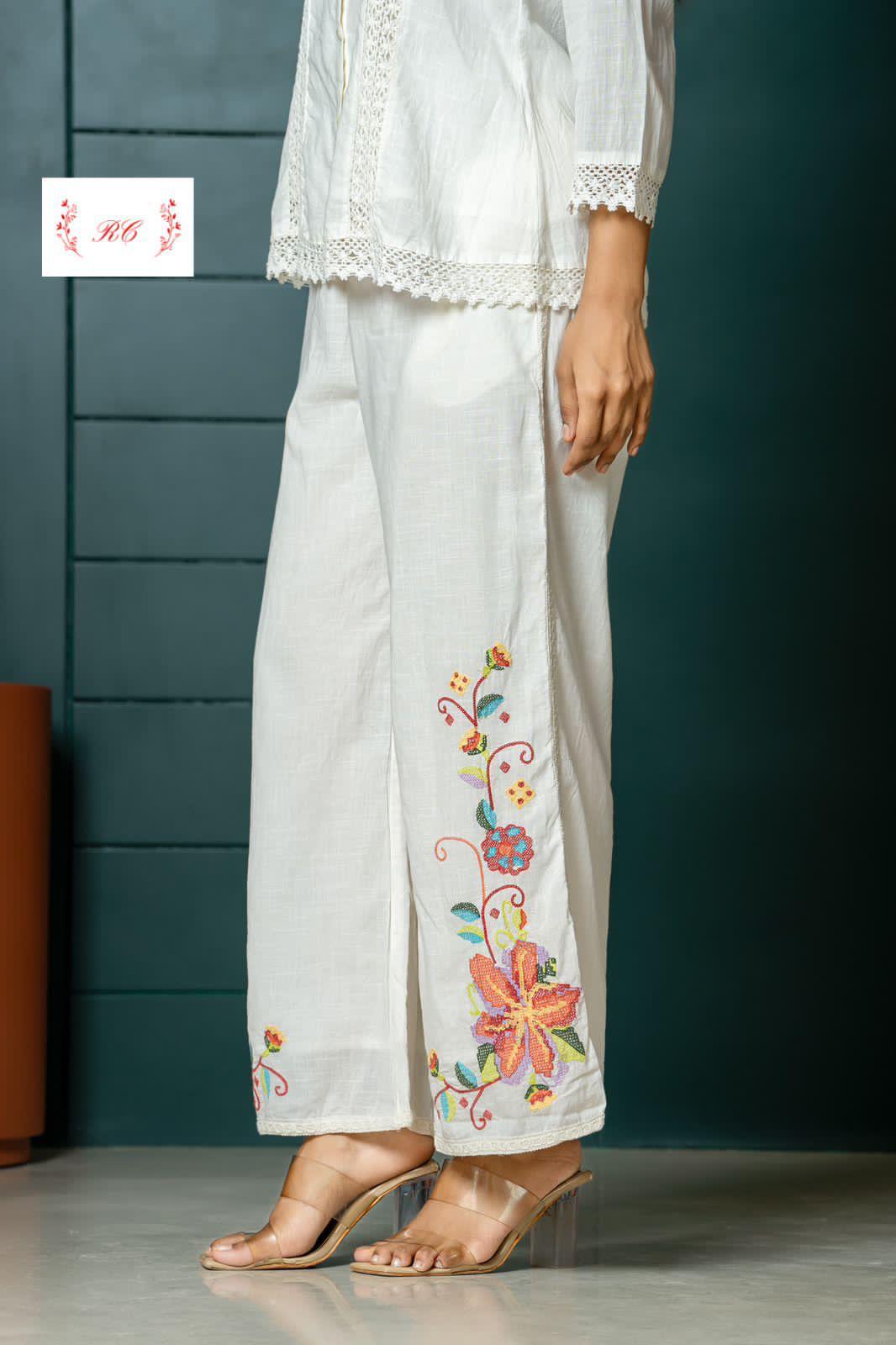 ☺️ pure soft linen cotton fabric stitched pants with attached lining with resham embroidery and crotia lace