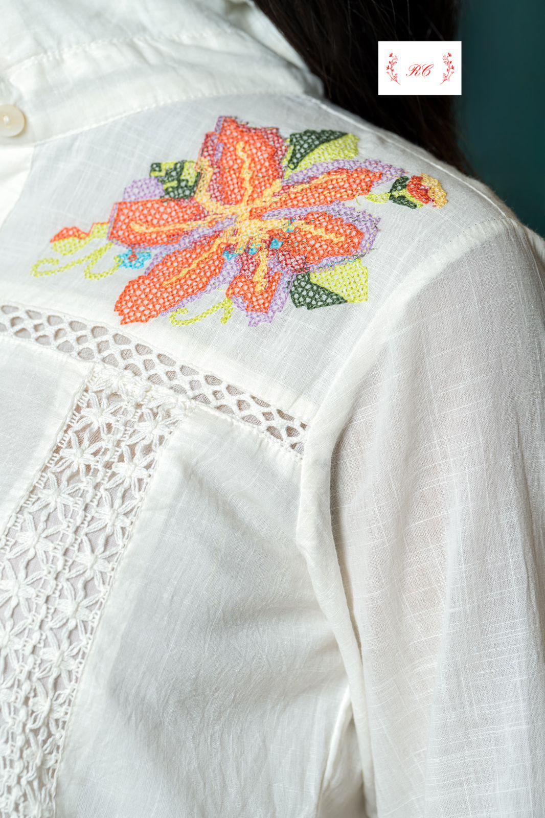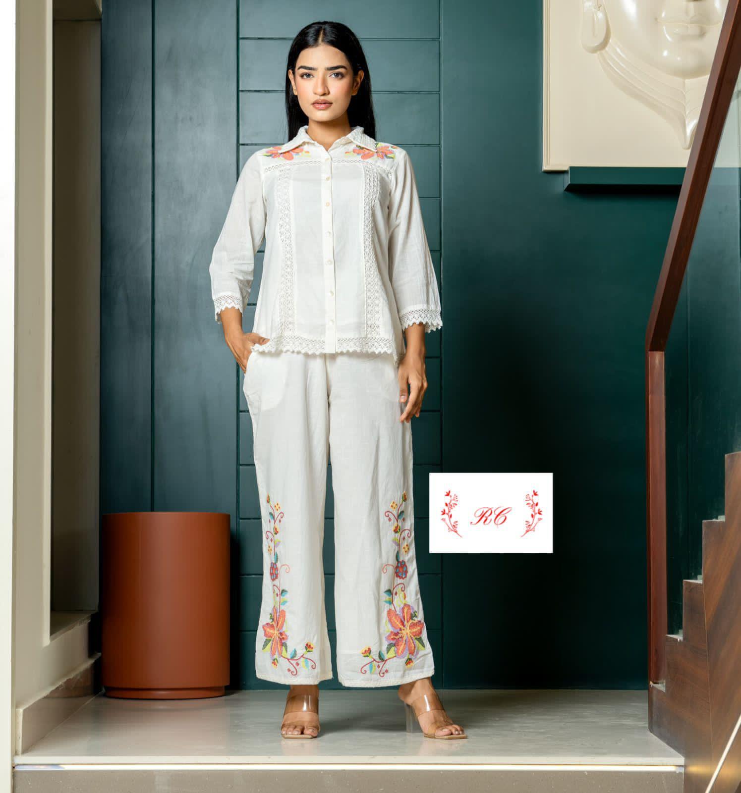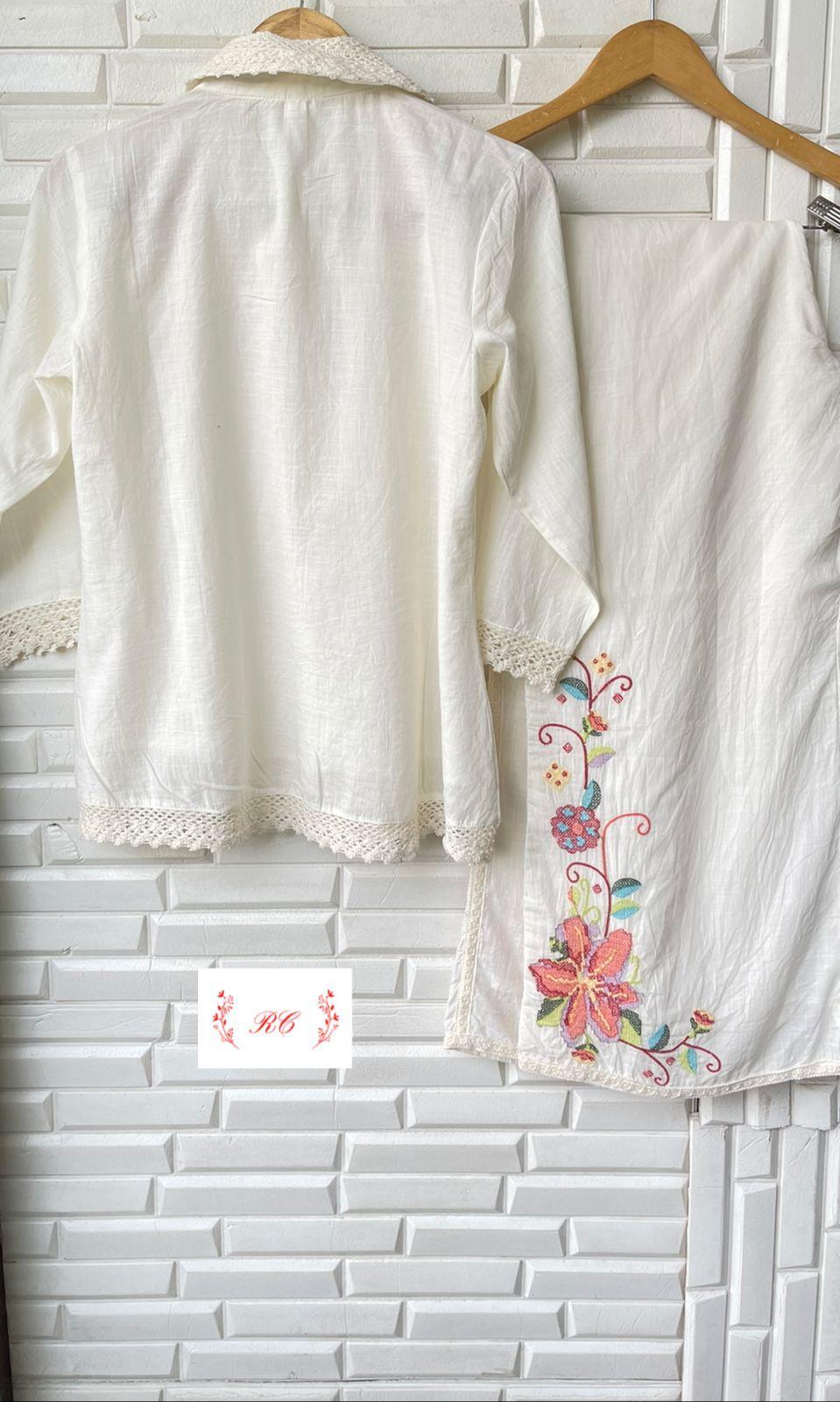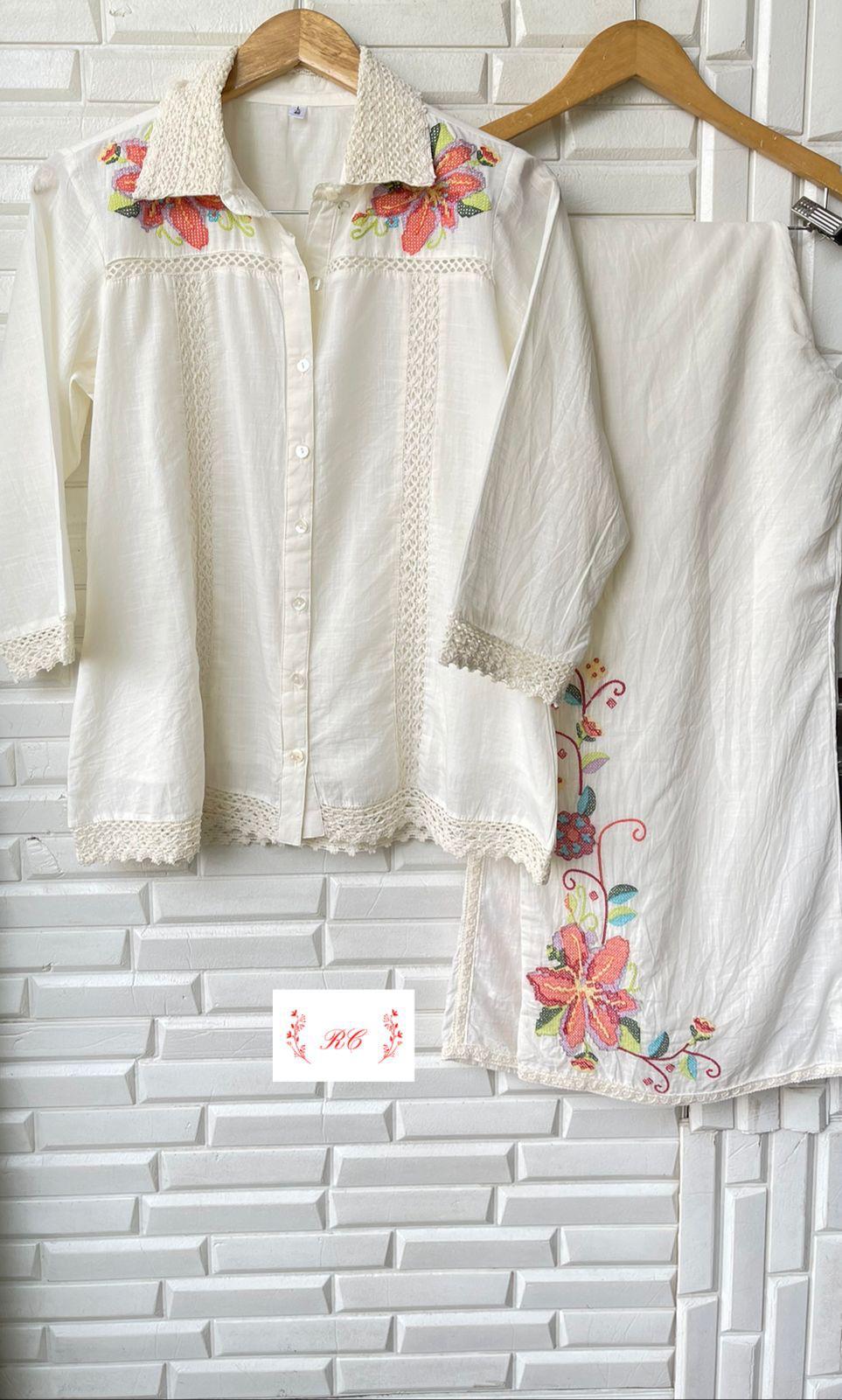 😊 soft pure linen cotton fabric stitched coord set shirt with resham embroidery and crotia lace and attached lining