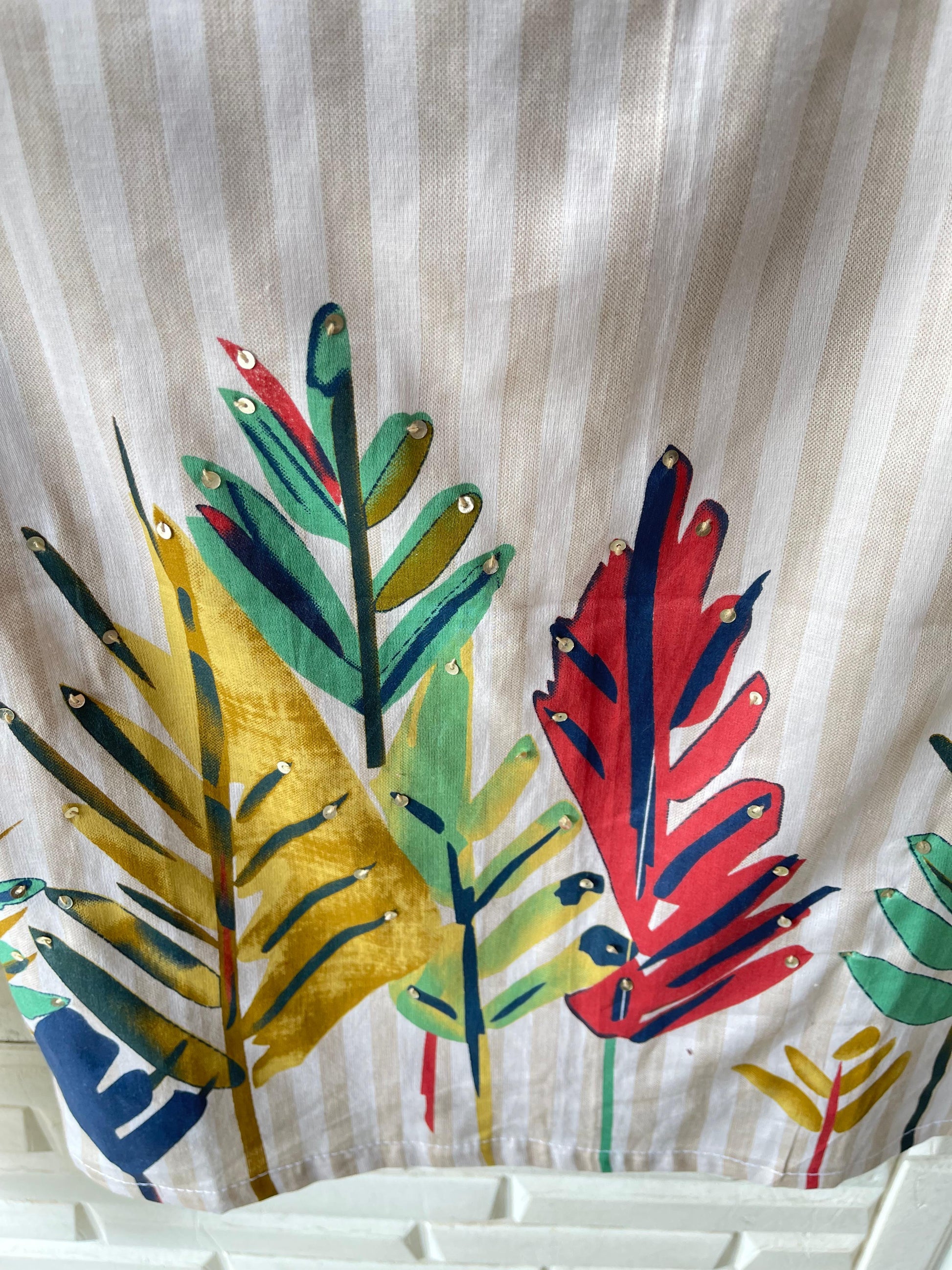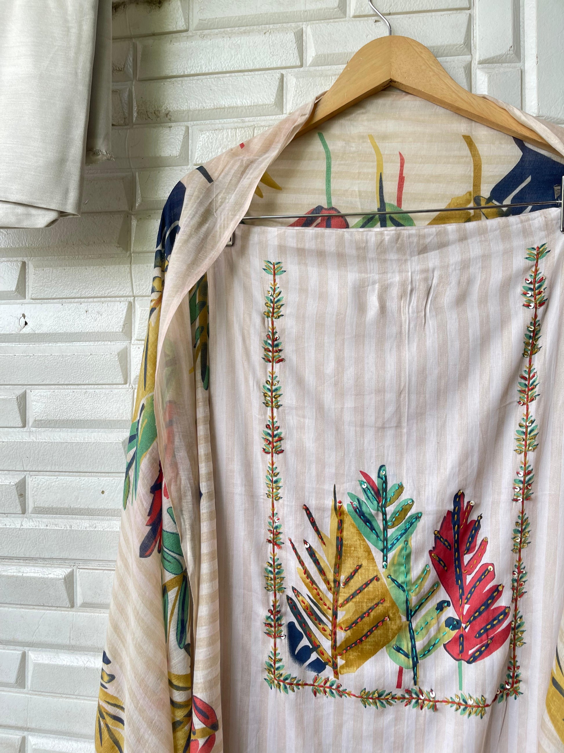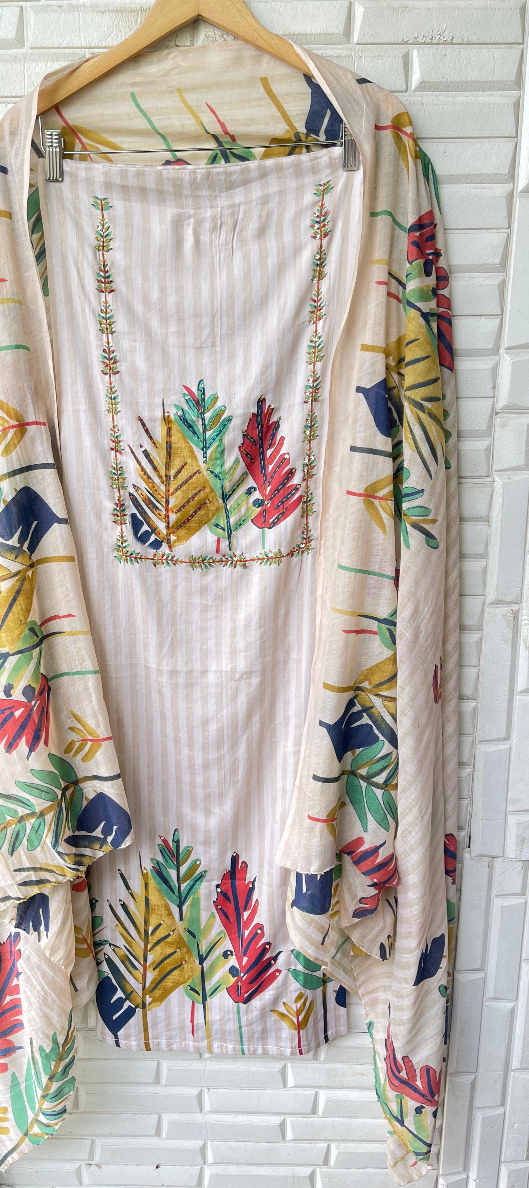 😊cotton printed unstitched shirt with sequins knots embroidery