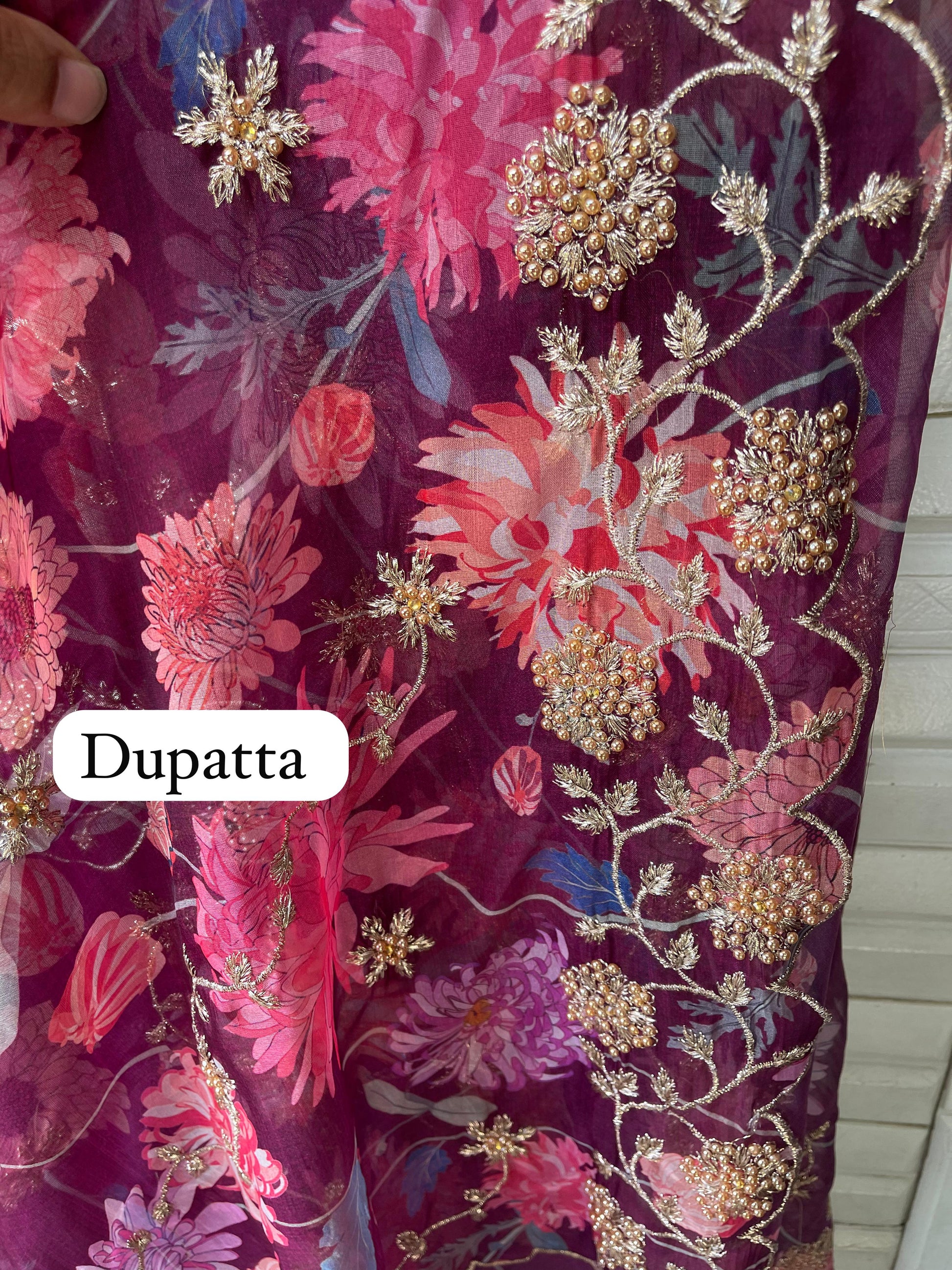 π pure organza printed fabric dupatta with full jaal zari golden pearl embroidery and zari scalping