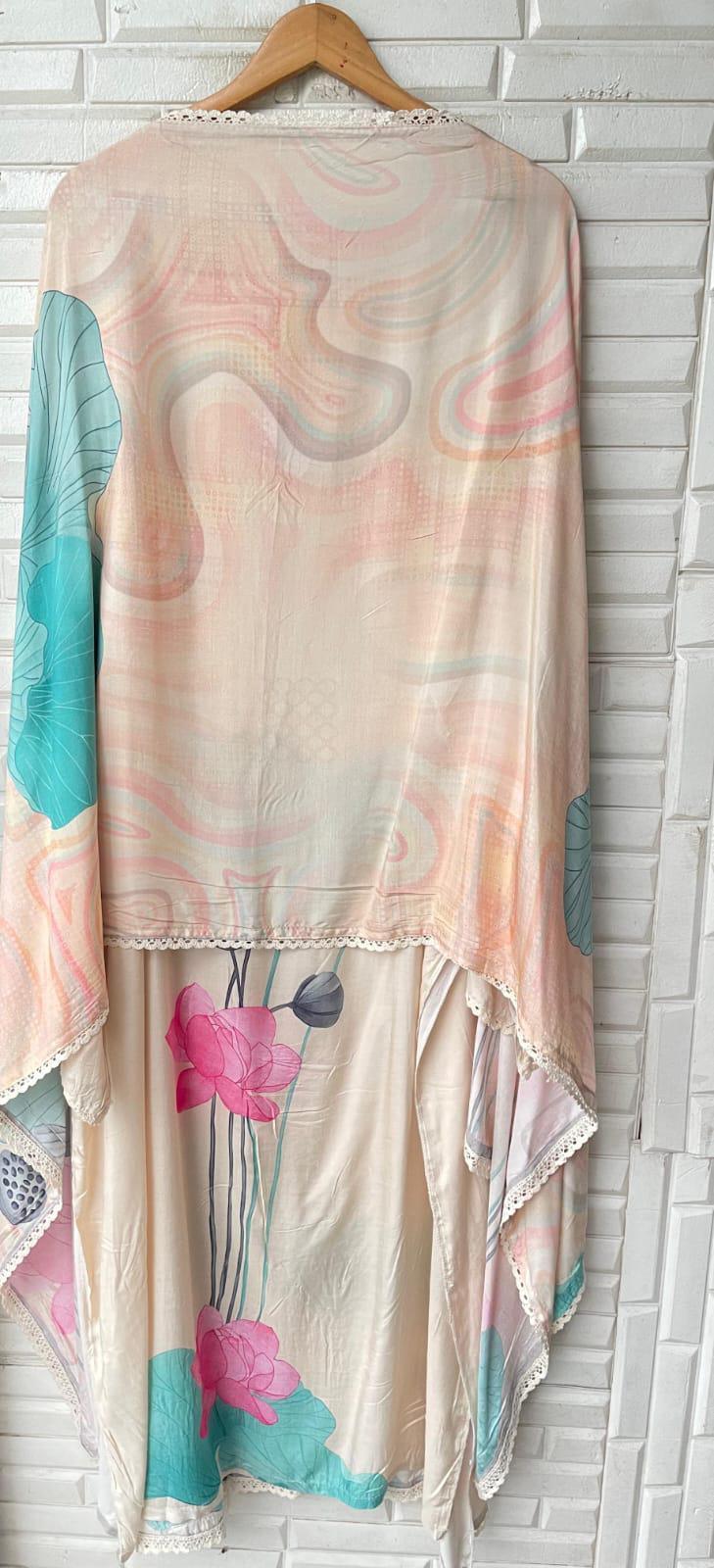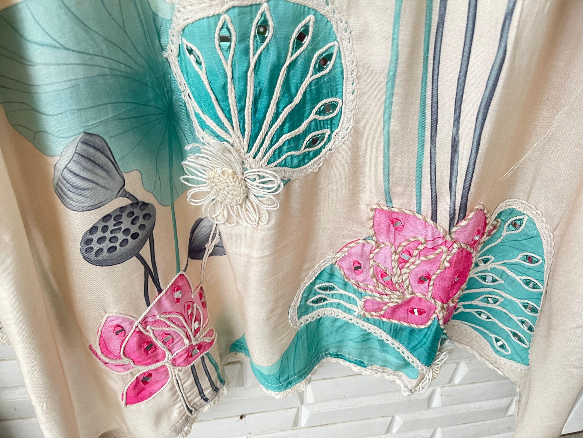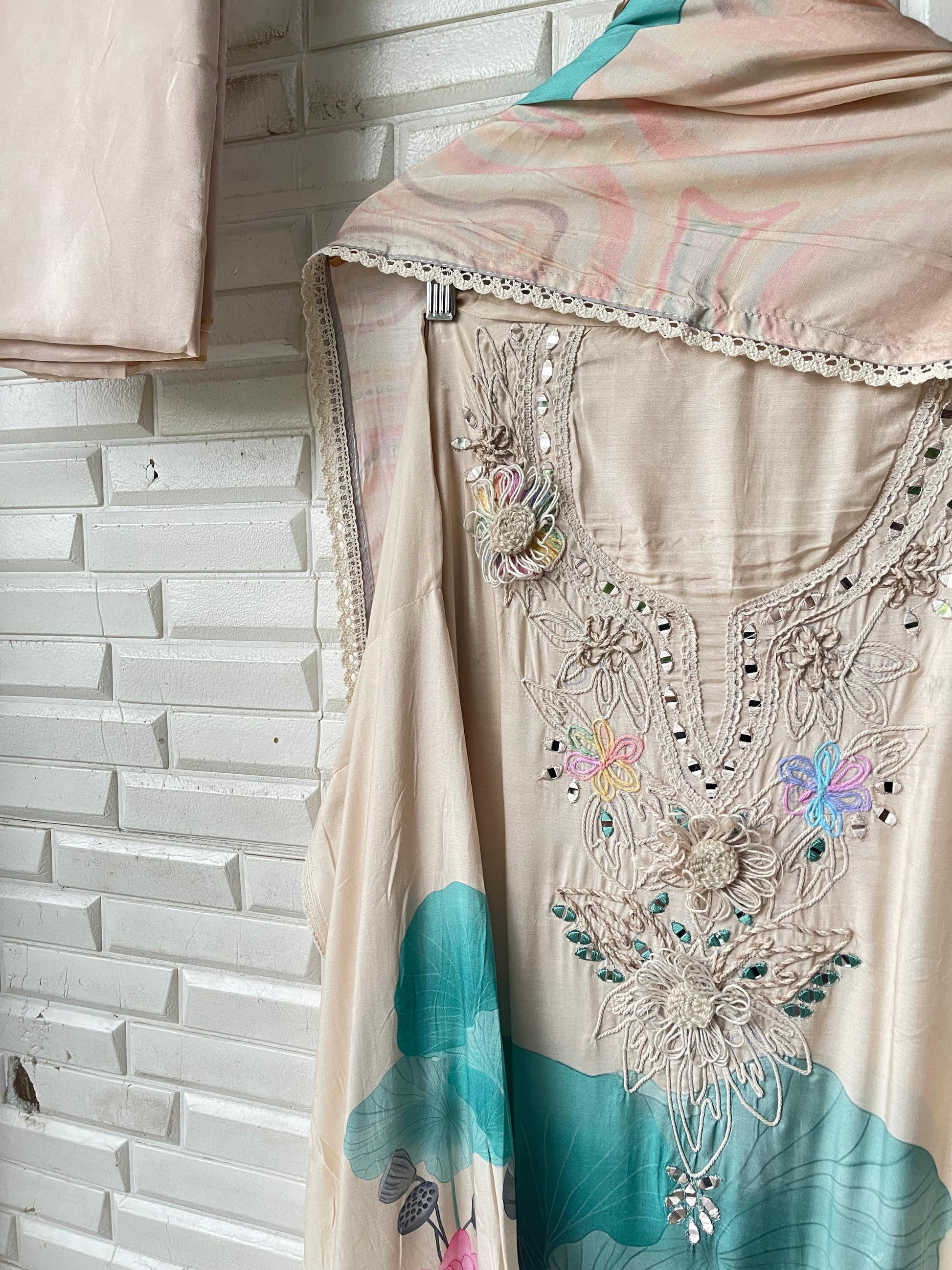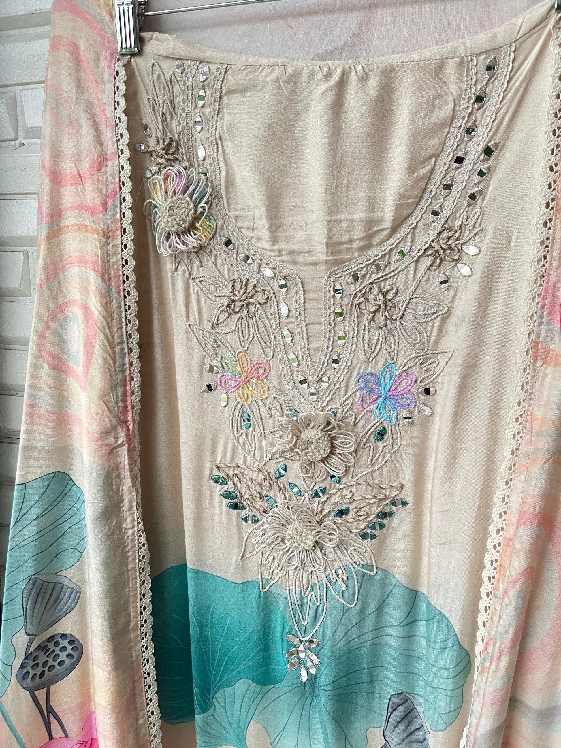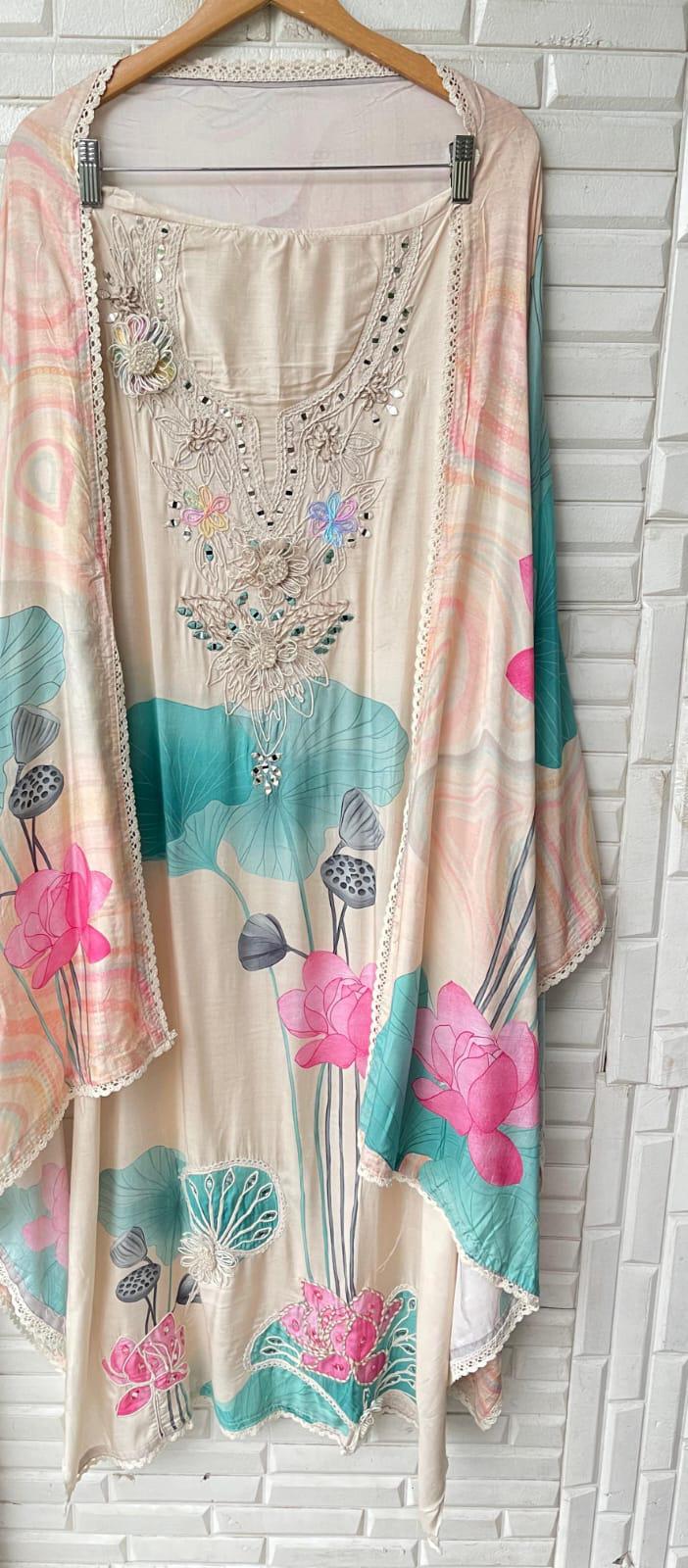 ๐ muslin fabric unstitched shirt with mirror work resham knots and jute 3d flower design and crotia lace workย