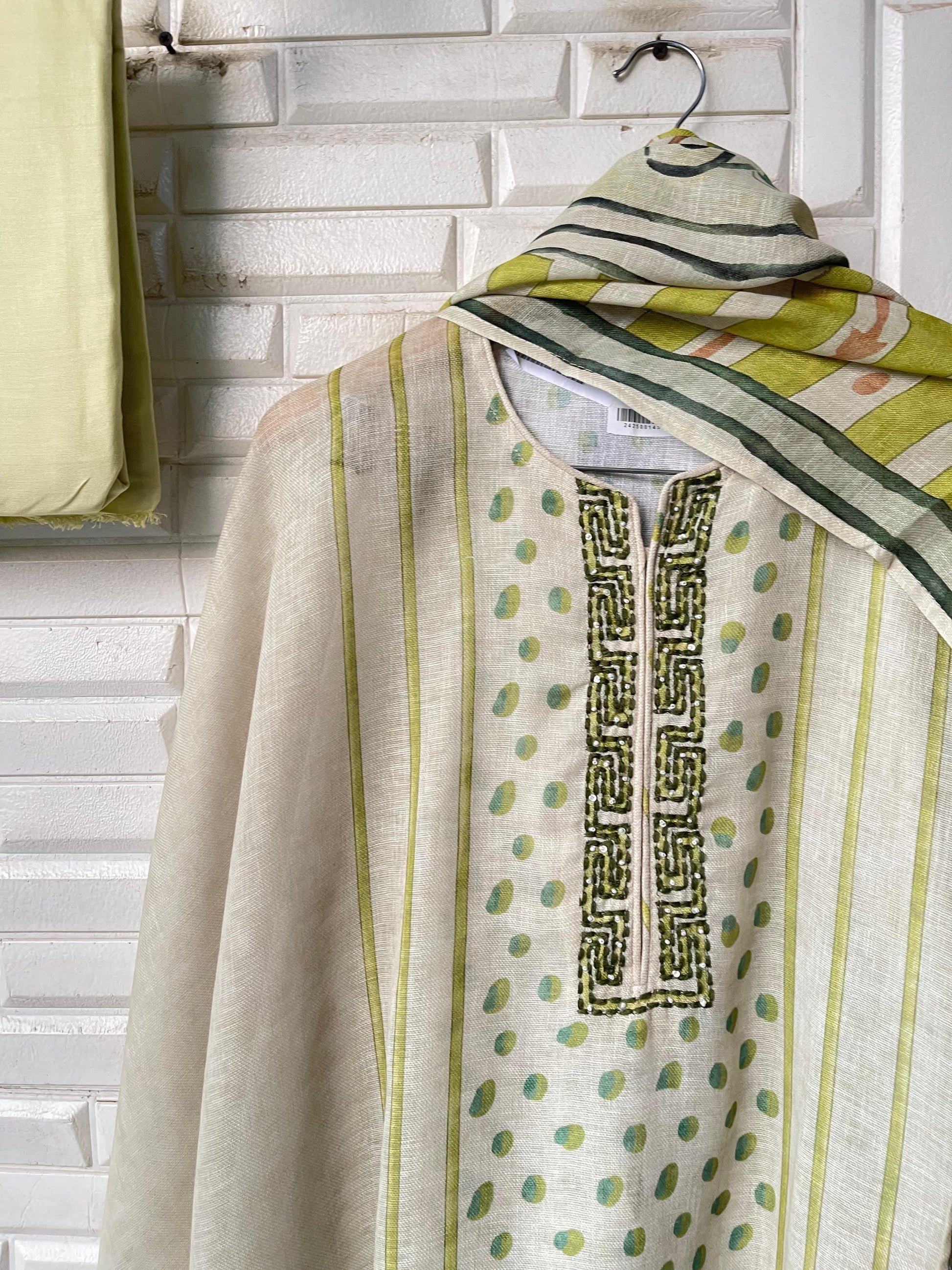 π pure linen printed un stitched shirt with resham knots sequence pearl embroidery